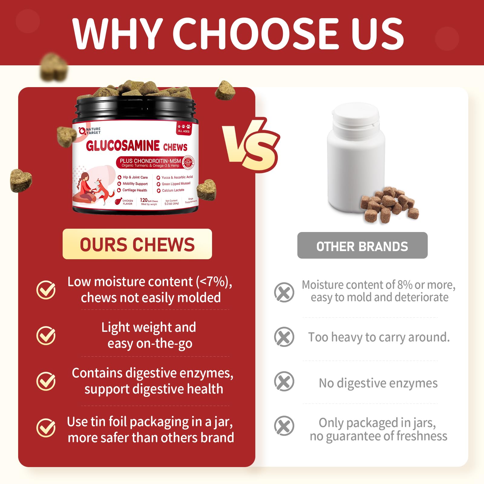 NATURE TARGET Glucosamine for Dogs, Joint Supplement with Chondroitin, MSM, Omega-3, Hemp for Pain Relief, Hip & Joint Chews for Dogs with Calcium for Bone Health, 120 Soft Chews
