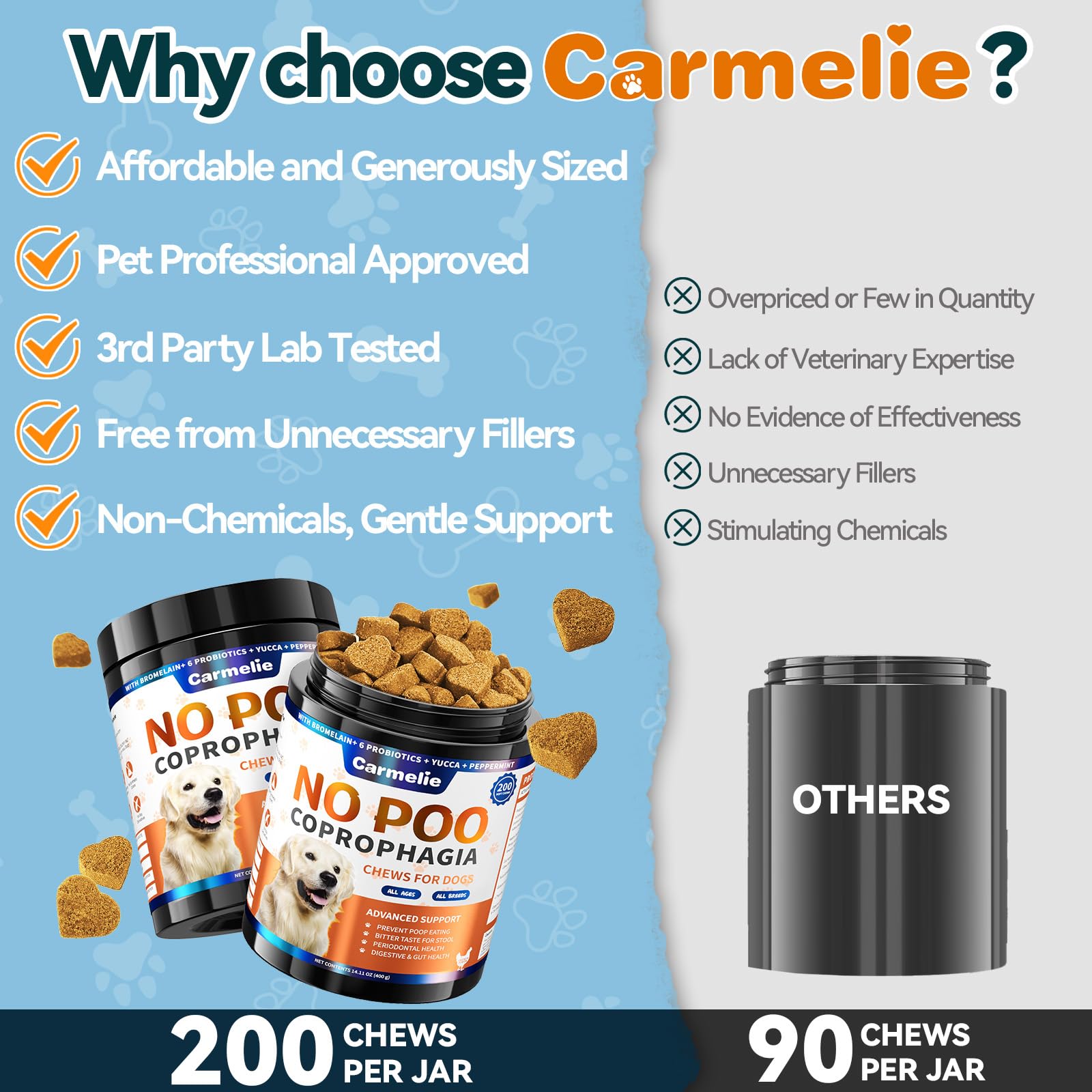 • Stop Stool Eating Naturally: Carmelie’s no poo chews for dogs help break the stool-eating habit by reducing the odor of stool, making it less appealing for your dog. Powered by a scientifically-backed formula, these no poo chews act as a natural deterrent, discouraging coprophagia and promoting better habits over time. Actual results may vary, but most pets see improvements after 2-4 weeks of regular use.