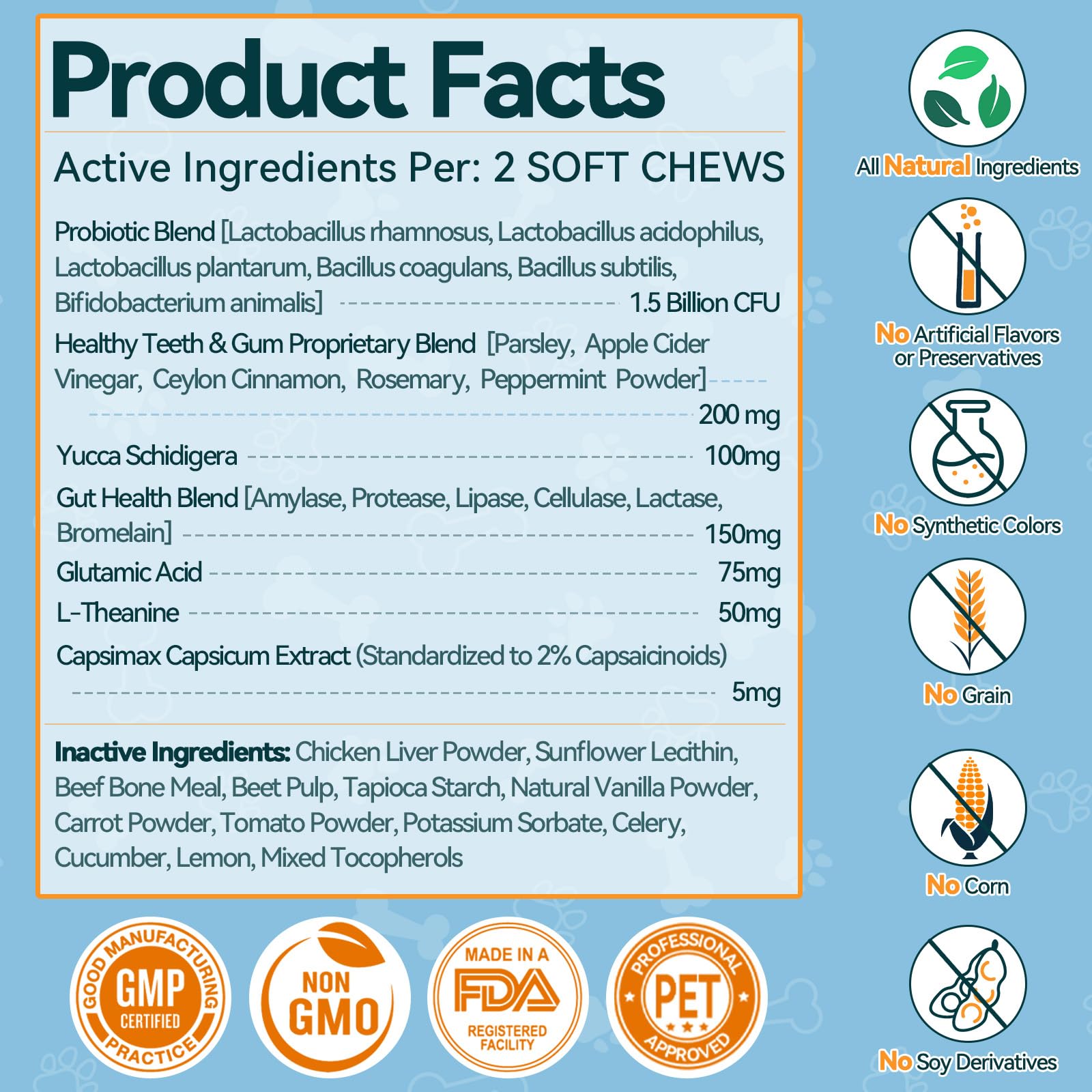 • Advanced Digestive & Gut Health Support: Rich in 1.5 Billion CFU probiotics, 6 digestive enzymes, and fiber, our coprophagia deterrent chews improve your dog's digestion, helping to balance the gut microbiome and support healthy nutrient absorption. Ideal for dogs with sensitive stomachs or regular digestive issues, supporting overall digestive wellness for dogs of all ages.