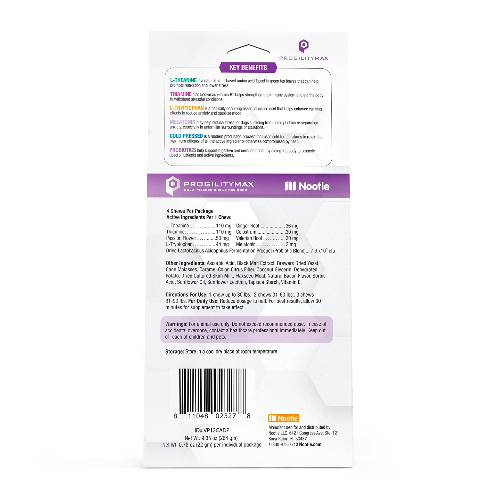 Details: Help keep your dog calm and relaxed with ProgilityMAX Calming Aid with Melatonin for Dogs by Nootie. This maximum strength calming formula helps dogs maintain normal emotional balance and cope with external stresses, such as separation, travel, motion sickness, or tension. These delicious bacon-flavored soft chews include a wide range of active ingredients including Melatonin and L-Theanine that work together to promote relaxation. Progility Calming supplement for dogs is also formulated with probiotics to help support digestive and immune health. This calming aid is great for dogs of all sizes; a 60 lb dog will only need half of a bar daily to see results. This product contains 12 single-serve bars per container.