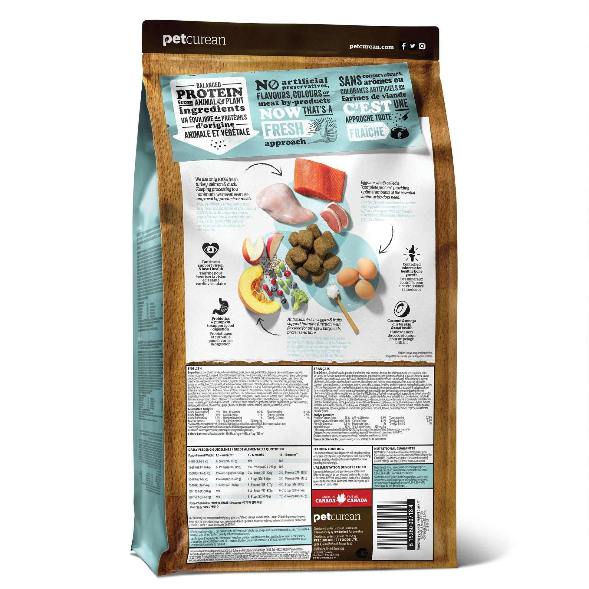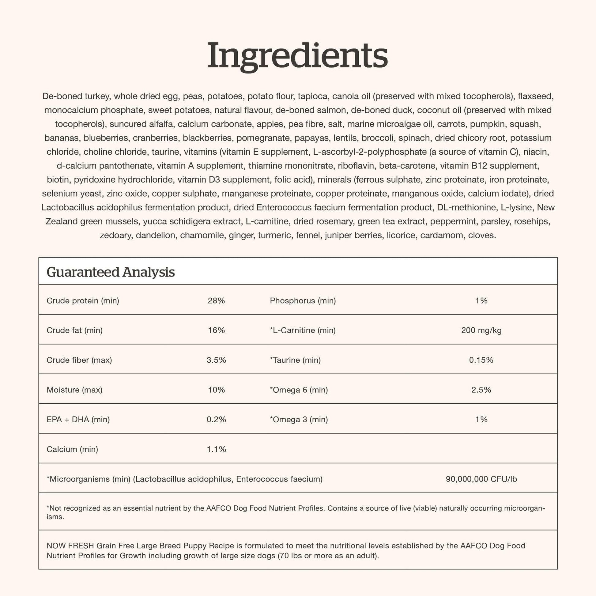Details: Your large breed puppy has a lot of growing up to do, which is hard work for their developing frames. Our Now Fresh Grain-Free Large Breed Puppy Recipe with Turkey, Salmon & Duck is expertly made to give them the best start possible, with controlled minerals for healthy bone growth. Featuring a tasty multi-animal protein blend of fresh de-boned turkey, salmon, and duck that's perfect for picky eaters. This chicken-free kibble is formulated with probiotics, fiber-rich pumpkin and sweet potato to support good digestion. Plus, antioxidants and essential nutrients from fruits and veggies help maintain a strong immune system. Expertly formulated to support your puppy’s healthy brain development and cognition with omega-3-rich salmon and marine microalgae oil, plus added taurine to support heart health—helping set a strong foundation for life. Made simply with minimal processing, this grain-free and gluten-free recipe is crafted without corn, soy, or wheat, using only wholesome ingredients from trusted suppliers. No by-product or meat meals, artificial flavors, colors, or preservatives. You can rest easy knowing that your pet is getting fresh and high-quality ingredients for optimal health and well-being. Made in Canada.