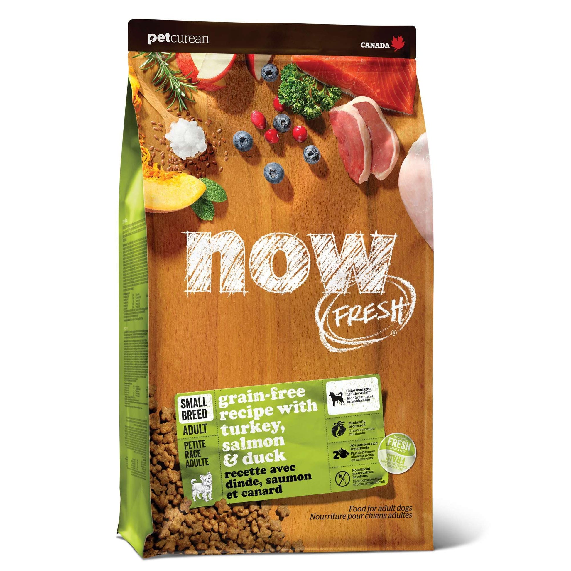Details: Your little pal deserves the best, so we made a diet tailored to their needs. Our Now Fresh Grain-Free Small Breed Adult Recipe with Turkey, Salmon & Duck is made with premium ingredients like fresh meats, fruits and veggies for delicious flavor and concentrated nutrition for little tummies. This grain-free dog food is crafted for little mouths, with parsley and peppermint to help keep their breath fresh, and small kibble for easy chewing. Featuring a tasty multi-animal protein blend of fresh de-boned turkey, salmon, and duck that's perfect for picky eaters. This chicken-free kibble is formulated with probiotics, fiber-rich pumpkin and sweet potato to support good digestion. Plus, antioxidants and essential nutrients from fruits and veggies help maintain a strong immune system. Made simply with minimal processing, this grain-free and gluten-free recipe is crafted without corn, soy, or wheat, using only wholesome ingredients from trusted suppliers. No by-product or meat meals, artificial flavors, colors, or preservatives. You can rest easy knowing that your pet is getting fresh and high-quality ingredients for optimal health and well-being. Made in Canada.