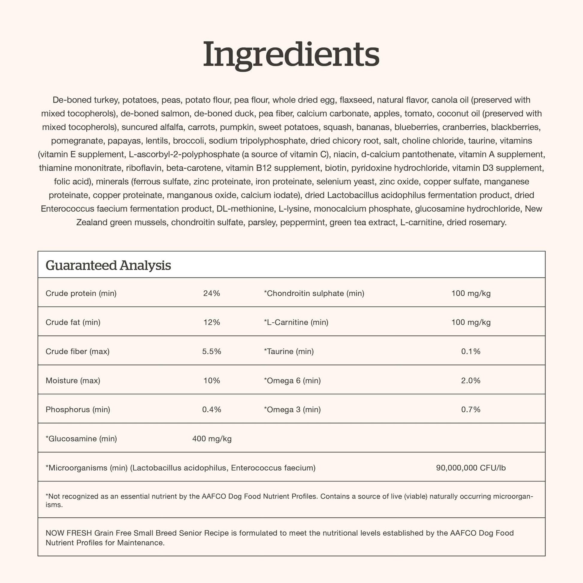 Details: Our oldest little pals often have unique needs, so we created our Now Fresh Grain-Free Small Breed Senior Recipe with Turkey, Salmon & Duck to help them thrive during their twilight years. Fortified with glucosamine and chondroitin for healthy hip and joint support, and made with moderate protein and fat to support weight management, this grain-free dog food recipe is specially crafted to help keep your small breed senior on the move. Plus parsley and peppermint to help keep their breath fresh and small kibble for easy chewing. Featuring a tasty multi-animal protein blend of fresh de-boned turkey, salmon, and duck that's perfect for picky eaters. This chicken-free kibble is formulated with probiotics, fiber-rich pumpkin and sweet potato to support good digestion. Plus, antioxidants and essential nutrients from fruits and veggies help maintain a strong immune system. Made simply with minimal processing, this grain-free and gluten-free recipe is crafted without corn, soy, or wheat, using only wholesome ingredients from trusted suppliers. No by-product or meat meals, artificial flavors, colors, or preservatives. You can rest easy knowing that your pet is getting fresh and high-quality ingredients for optimal health and well-being. Made in Canada.
