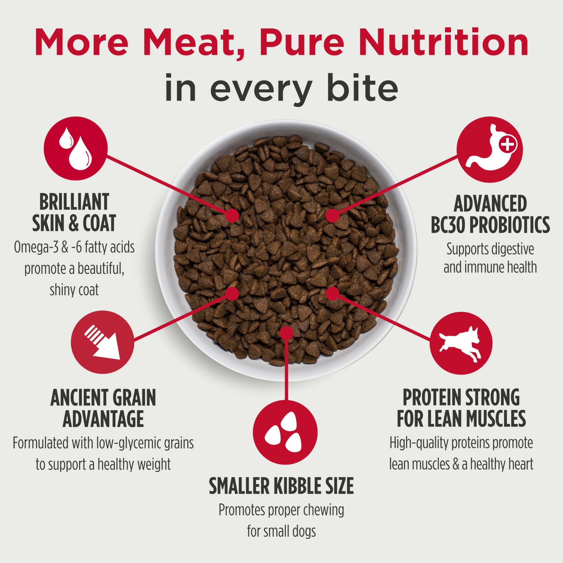 - Boosts Heart & Skin Health with Omegas – This ancient grain small dog food with taurine and omegas -3 & -6 helps support heart health, brain function, and a shiny coat—fueling your pet from the inside out.