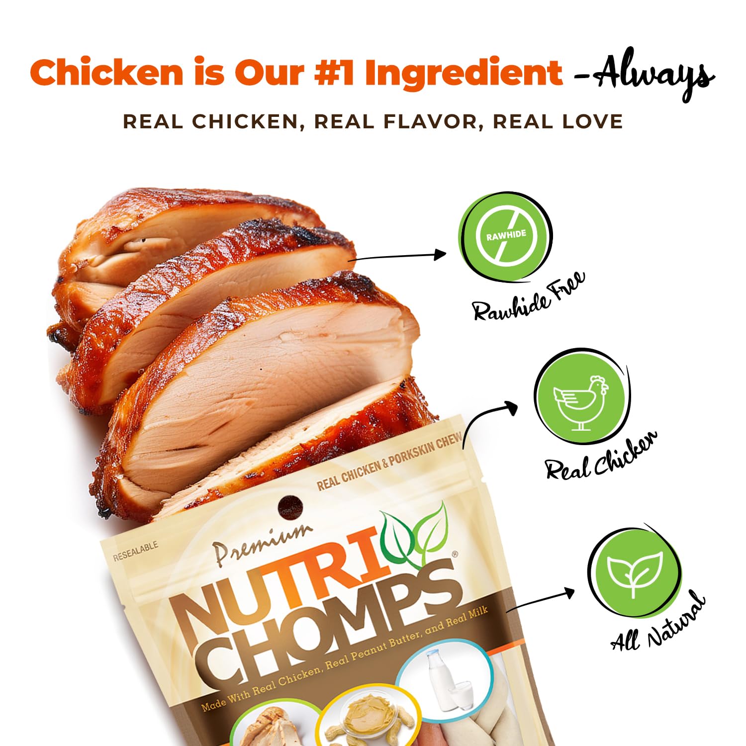Details: You pay close attention to the ingredients in your favorite foods, so it only makes sense to do the same for every member of the family – including your fur family! Made with real chicken and pork skin, NutriChomps are sure to become your dog’s favorite treat. They are fortified with vitamins and minerals, making them as delicious as they are nutritious. Along with yummy protein from chicken and pork skin, we add vitamin E to help boost your dog’s circulatory system health. Added manganese sulfate assists with nervous system function, while riboflavin supplements support skin, eyes, and abdomen health. Indulging in dog treats has never been so healthy for your pup. We recommend that you treat your dog to a NutriChomps chew to alleviate boredom, reward good behavior or simply as an everyday treat. Not only do our chews provide plenty of entertainment but also help improve dental hygiene. These wholesome chews promote good dental health by helping to remove plaque and tartar from their teeth and gums as they chew. Why 100% Rawhide Free? Rawhide chews for dogs are only partially digestible which means the remaining product can create potential digestion issues in dogs. Because NutriChomps are 100% rawhide-free, they’re easy to digest. Even the pups with the most sensitive of stomachs will love these dog chomps. What Makes Your Dog Obsessed with NutriChomps? Oven-roasted chicken, real peanut butter and creamy milk are flavors pups crave! Manufactured in a state-of the-art facility that has been certified by the same standards as human grade food. NutriChomps facility is one of the few pet manufacturing facilities in the world to receive GFSI certification. We are proud of the dedication, hard work and commitment to quality that was required to earn this elite, quality certification. Give your precious pup the tasty reward they’ve been barking for!