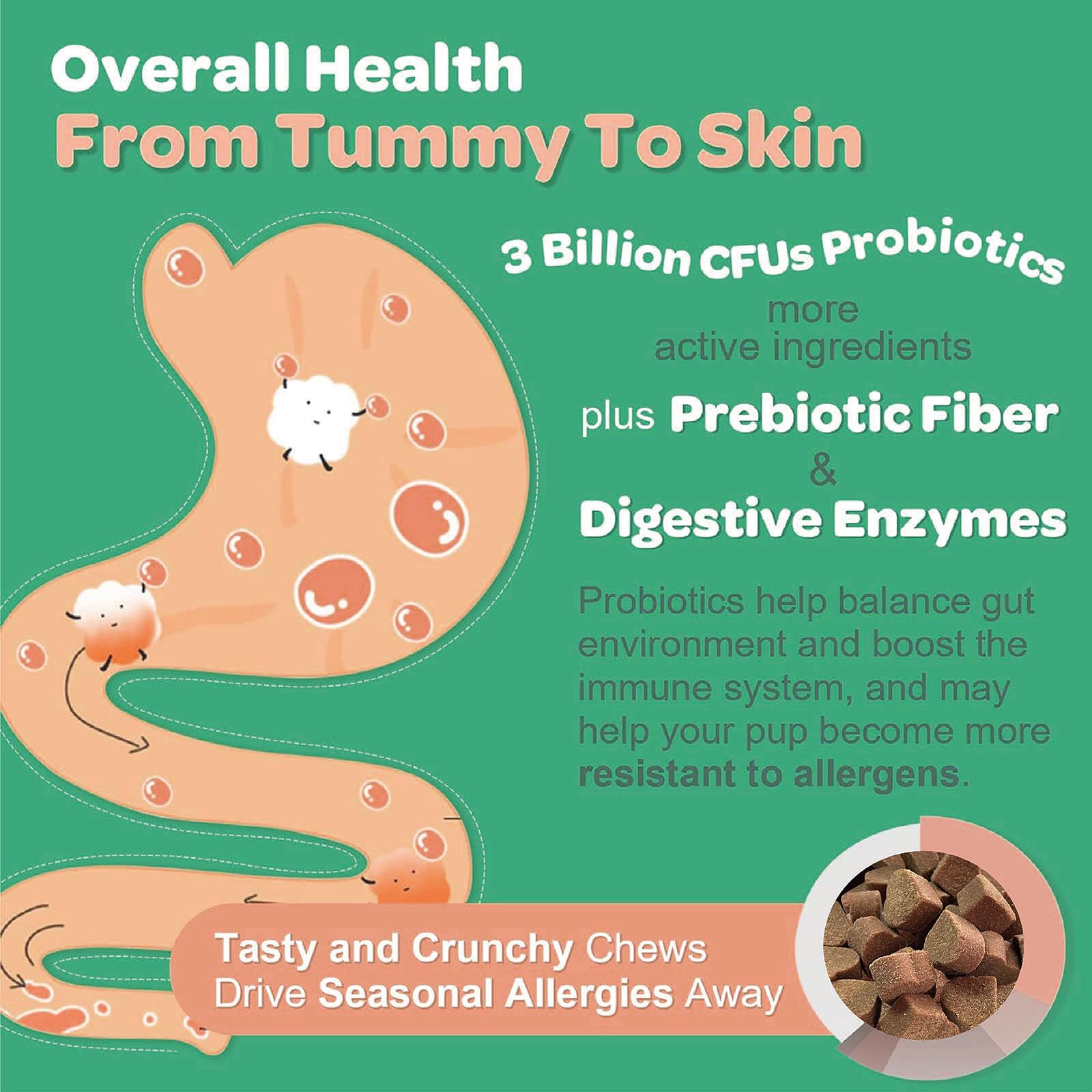 • 【Gut & Yeast Balance for Long-Term Wellness】​ Target digestive discomfort and smelly ears with ​Prebiotic Inulin and ​6 Billion CFU Probiotics that restore gut flora and block allergens. Enriched with ​Colostrum, it strengthens the gut barrier to prevent yeast overgrowth and supports healthy histamine levels. Ideal for dogs prone to recurring hot spots, digestive issues, or allergy-related paw biting
