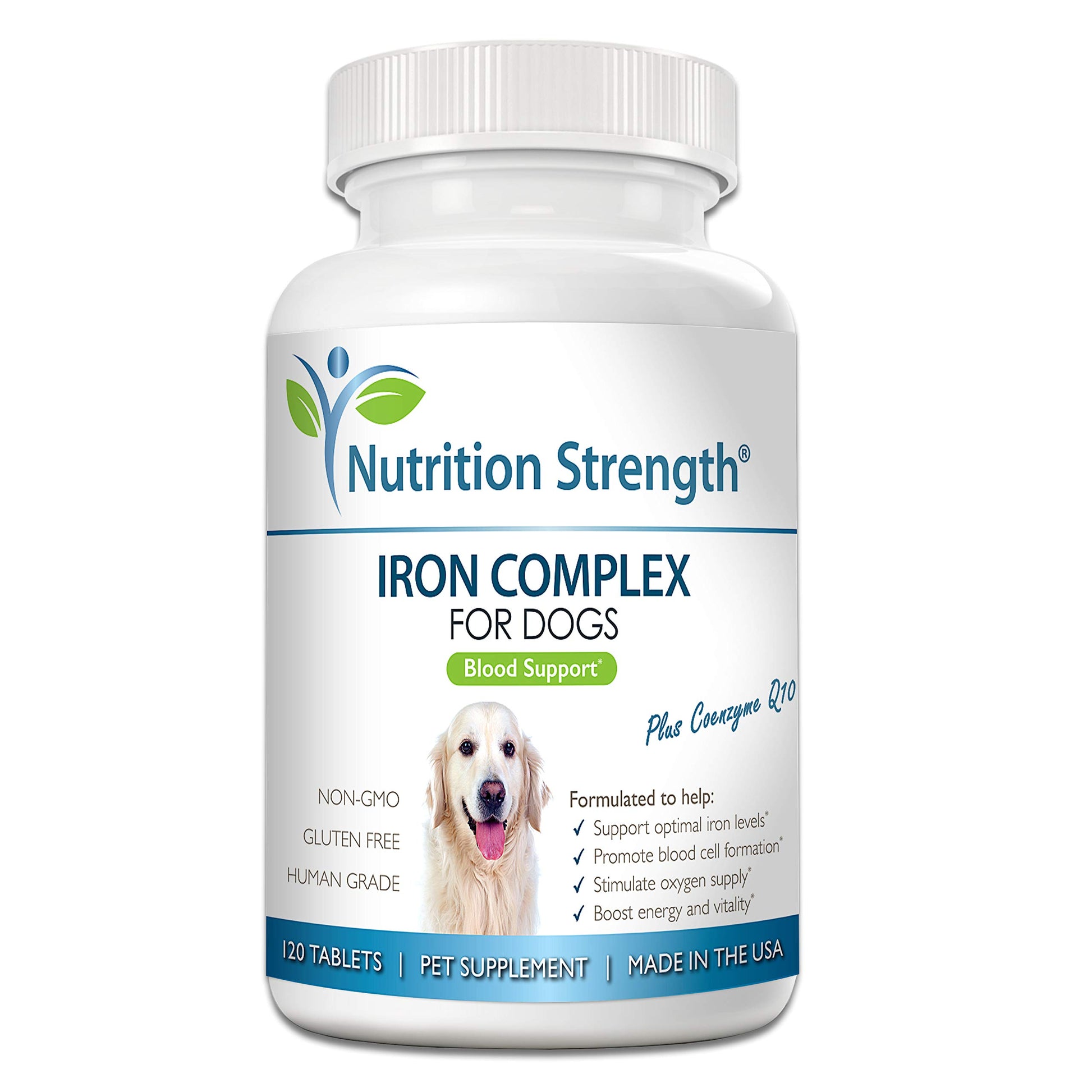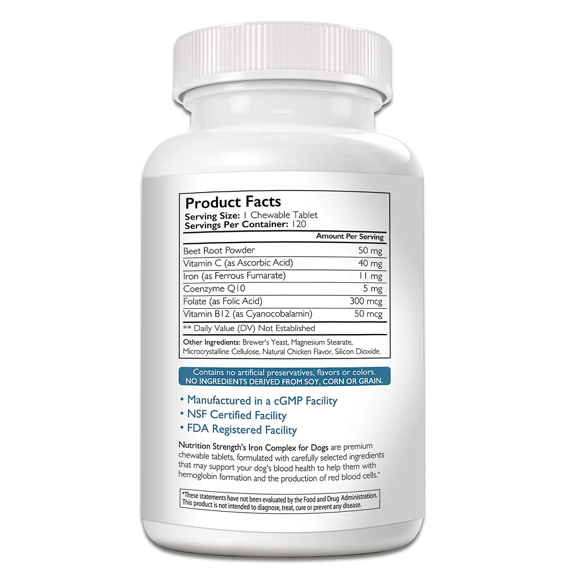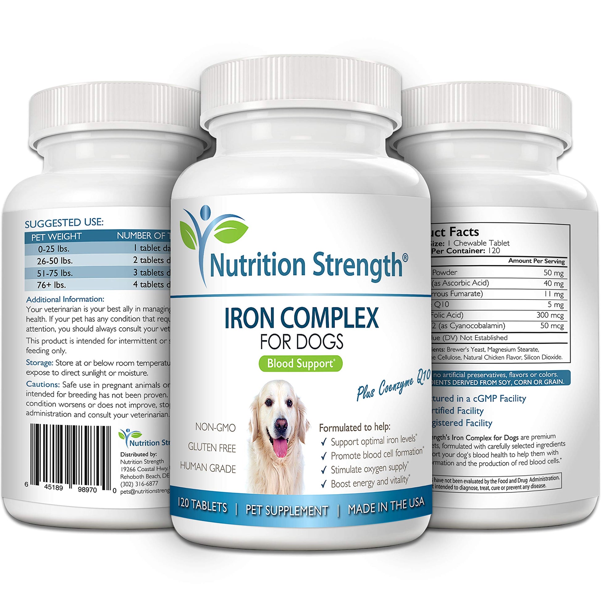 - Made in the USA: Nutrition Strength's iron for dogs to support blood health, promote blood cell formation and oxygen supply, iron supplement for anemic dogs with vitamin C, folate and vitamin B12 is human grade; our premium canine iron tablets meet the strictest animal supplement manufacturing guidelines, to guarantee your pet's safety, and are made with carefully selected, high quality ingredients for optimal results