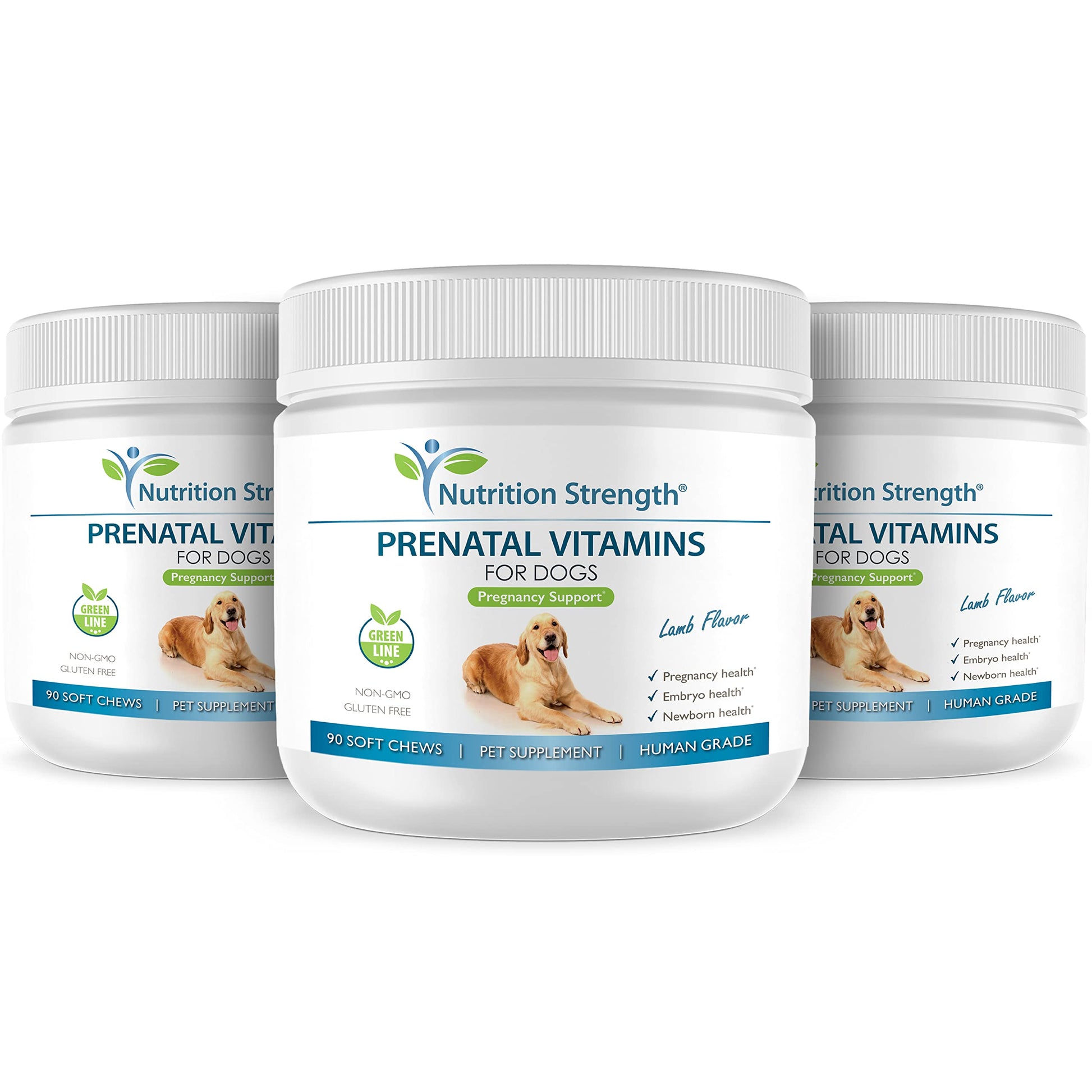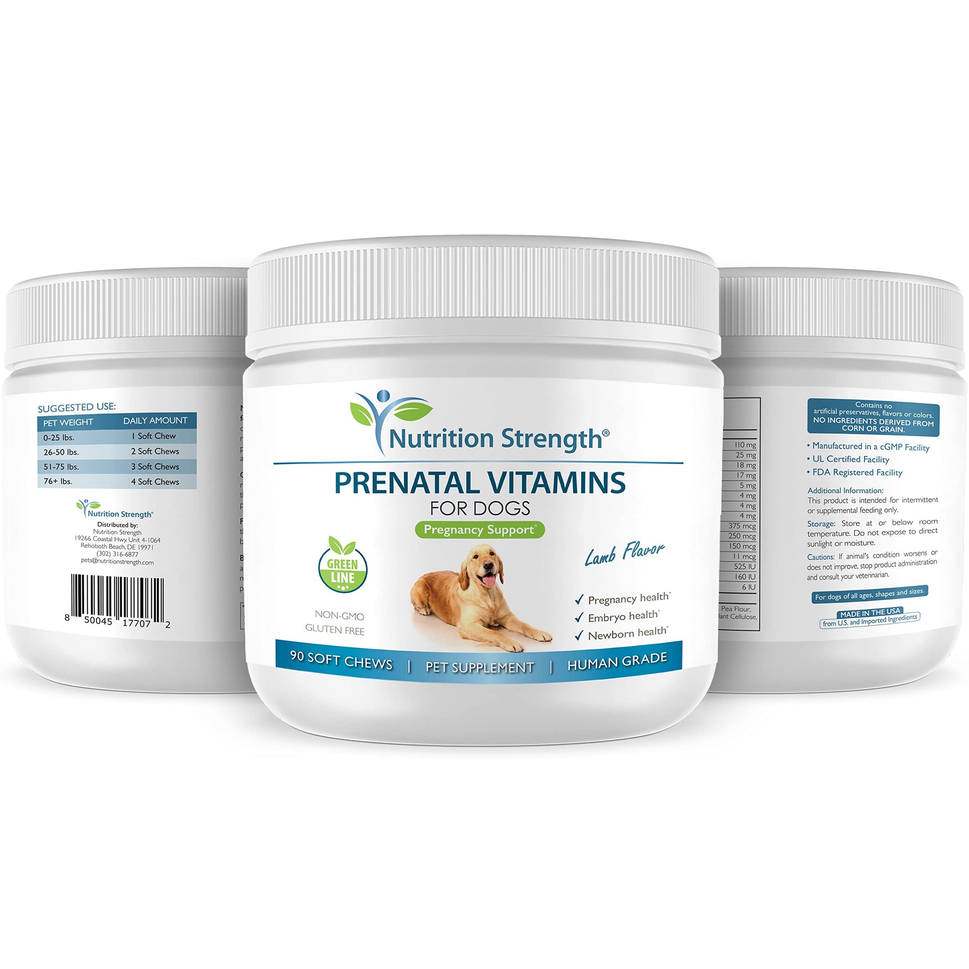 - Made in the USA: Nutrition Strength's prenatal vitamins for dogs to support development of healthy puppies, promote milk production, with folic acid, iron, zinc, iodine, B vitamins for pregnant dogs is human grade; our premium vitamins for lactating dogs soft chews meet the strictest animal supplement manufacturing guidelines, to guarantee your pet's safety, and are made with carefully selected, high quality ingredients for optimal results