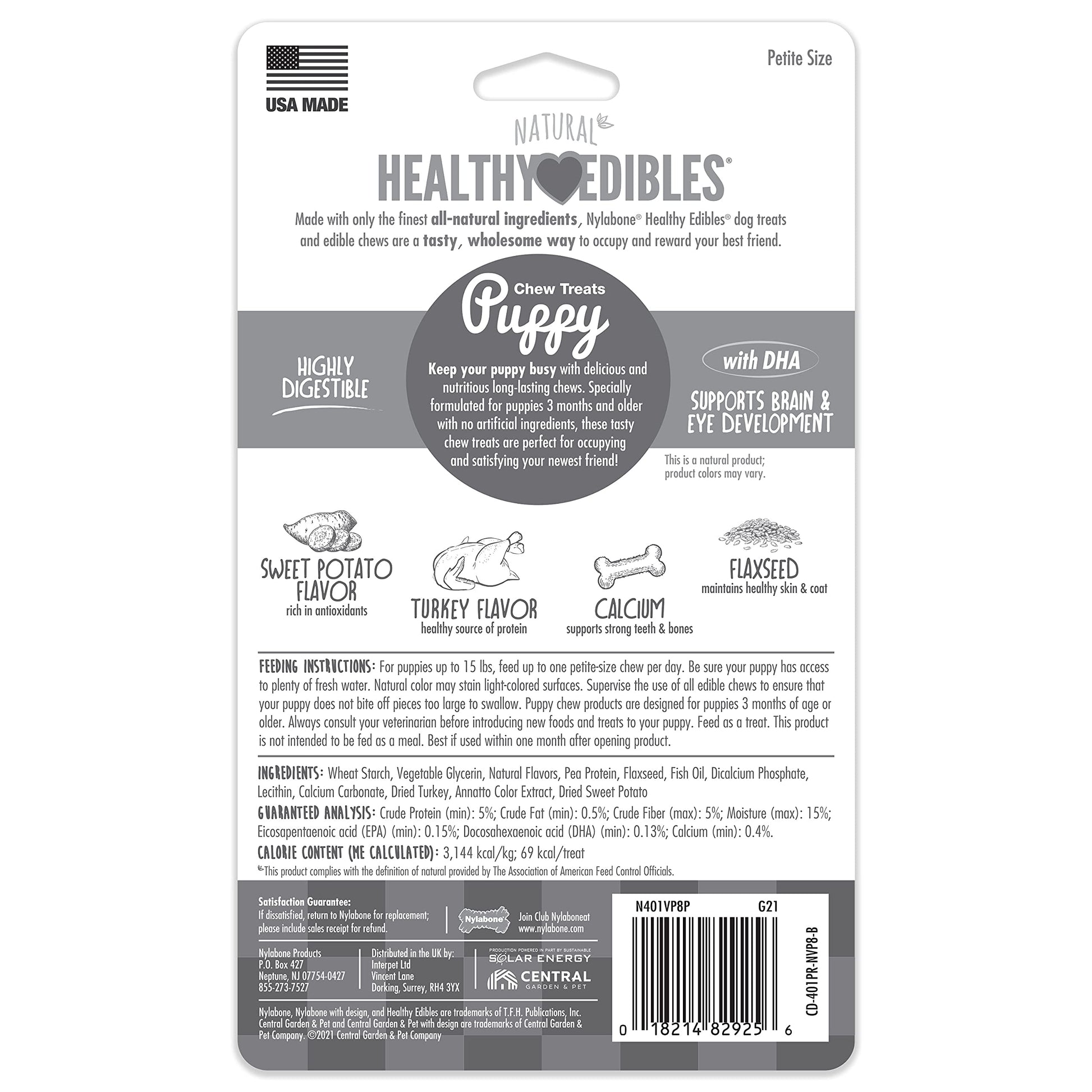 These puppy treats are specifically formulated to help support growing puppies' brain and eye development! Featuring yummy turkey & sweet potato flavor, our puppy chews will keep your pup occupied and satisfied. Plus, they include calcium to support strong teeth & bones and flaxseed to help maintain skin and coat health.