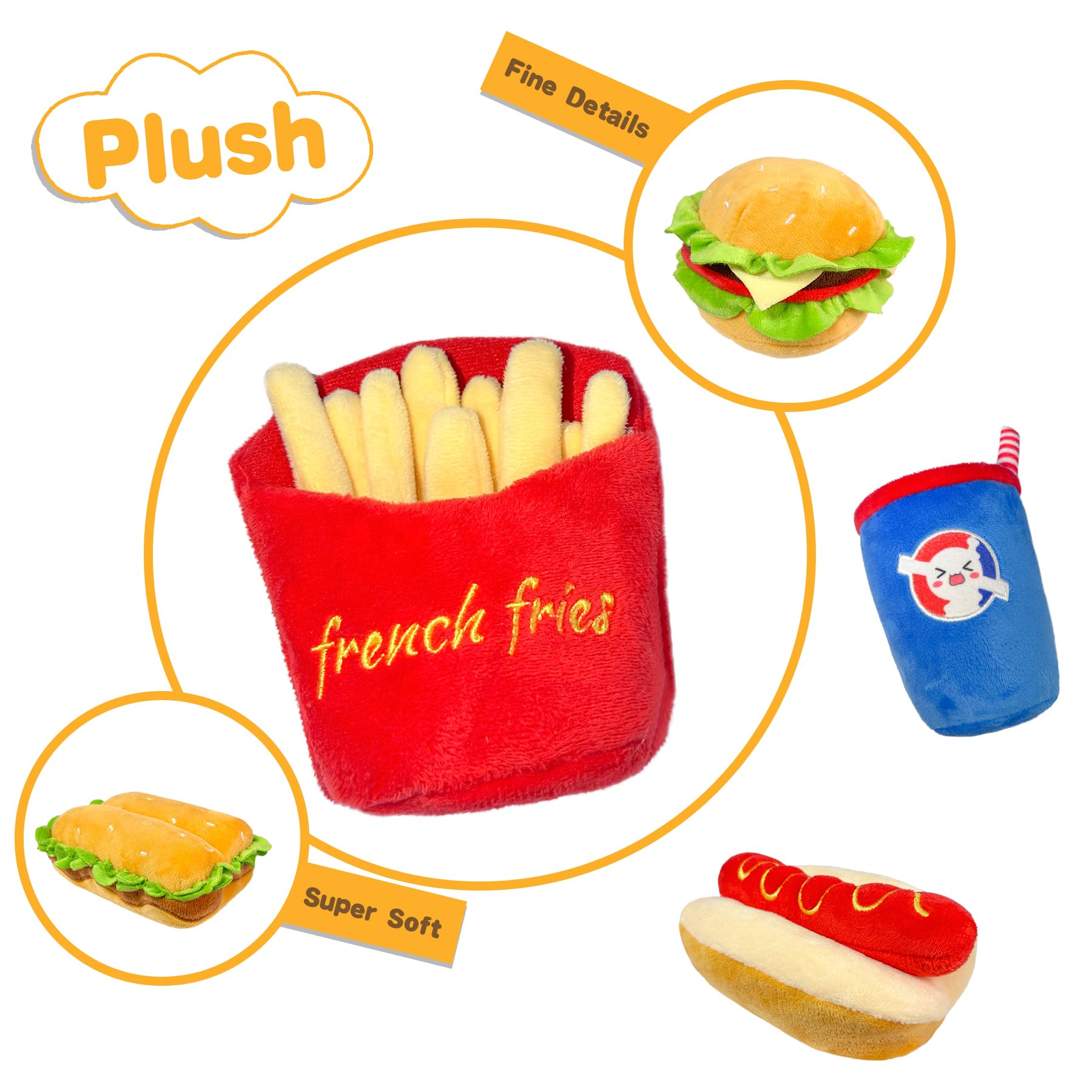 - 【Cute appearance of dog toys】Squeaky dog toys include French fries, chicken burgers, hamburgers, hot dogs, cola, and buckets that can hold these fast food dog toys. Every dog chew toy has a realistic appearance and soft touch, the dog teething toys with three-dimensional and realistic shape, soft touch, and higher quality than other similar products.