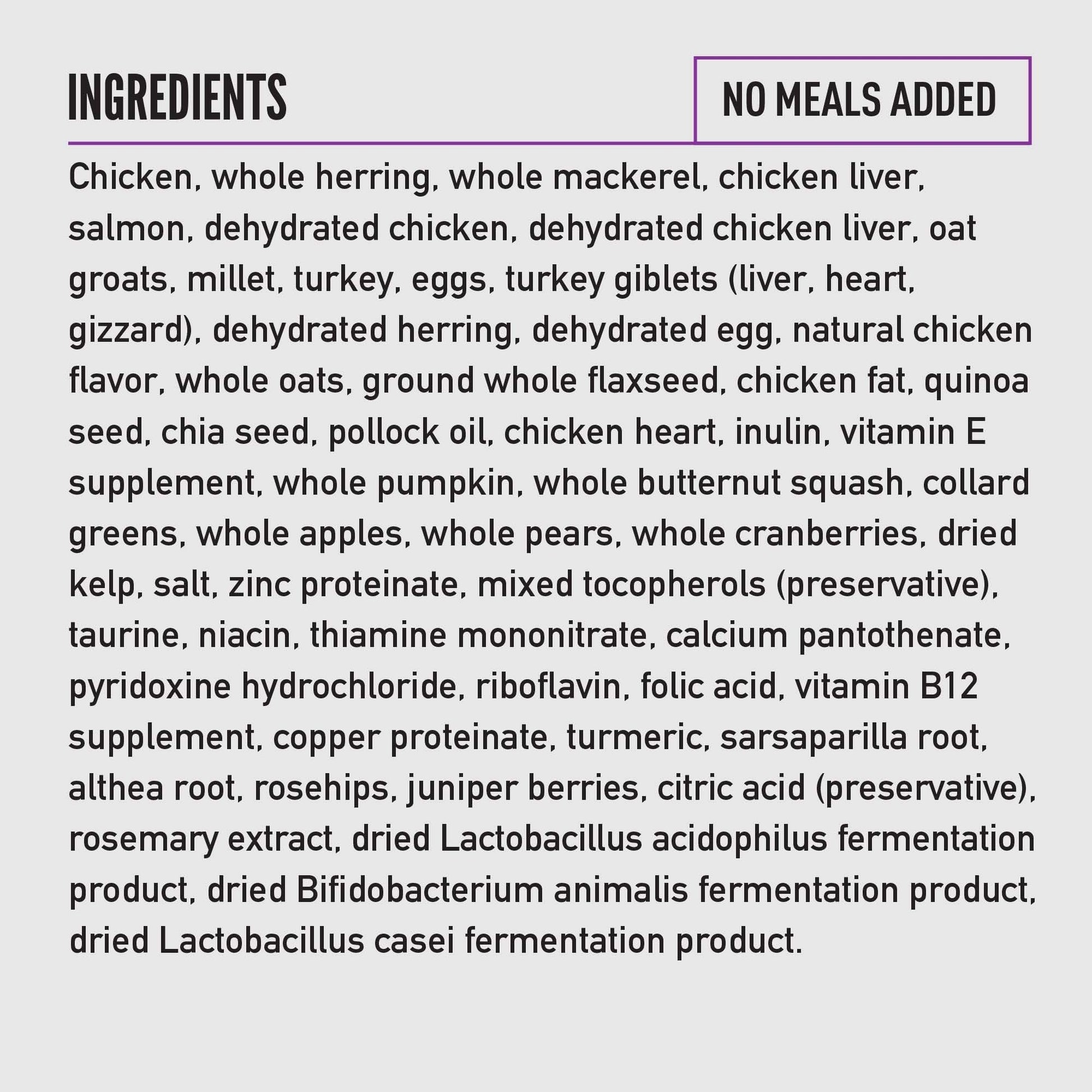 - The first five ingredients are fresh or raw chicken, whole herring, whole mackerel, chicken liver and salmon with protein, vitamins and minerals