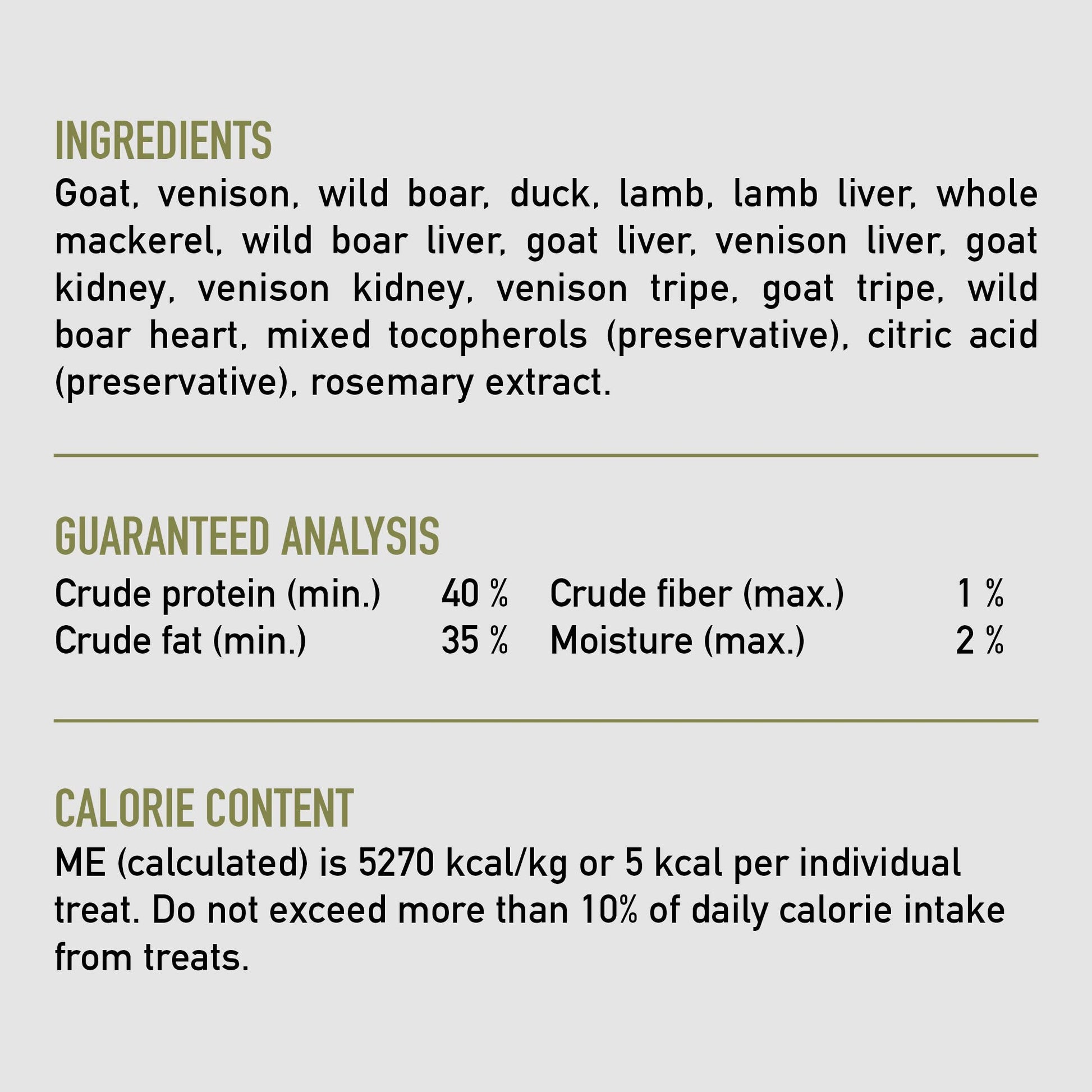 Details: Treat your dog with delicious and nutritious ORIJEN Freeze Dried TUNDRA Dog Treats. These ORIJEN dog treats are freeze dried to lock in the rich nutrients and taste, making them packable and perfect for adventures. At just 5 calories each, these treats are loaded with protein and amazing flavor. Containing 99 percent animal ingredients*, ORIJEN dog treats provide a high protein option for training or rewarding your dog. These high protein dog treats are made with high-quality animal ingredients, including goat, venison, wild boar, duck, lamb and mackerel, giving your dog an amazing taste! ORIJEN WholePrey ingredients including nourishing organs provide your dog with the most succulent and nutrient-rich parts of prey. *Approximate and derived from the unprocessed state of the ingredients.