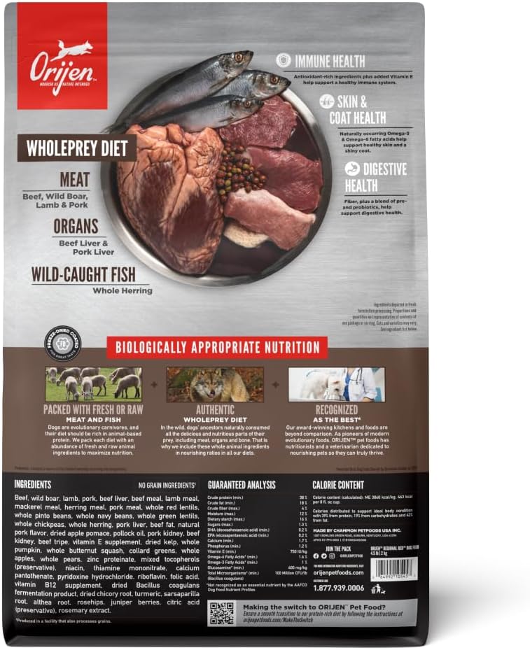 - One (1) 4.5 lb bag of ORIJEN REGIONAL RED Dry Dog Food
