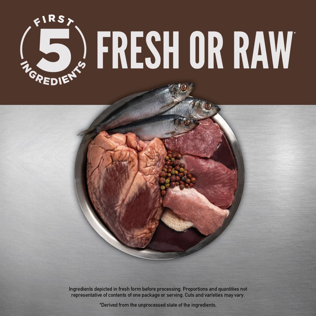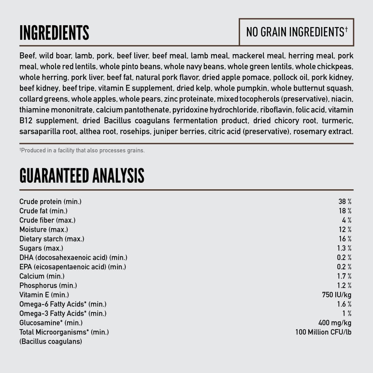 - The first five ingredients are fresh or raw farm-raised beef, wild boar, lamb, pork and beef liver to give your dog a strong daily source of protein, vitamins and minerals