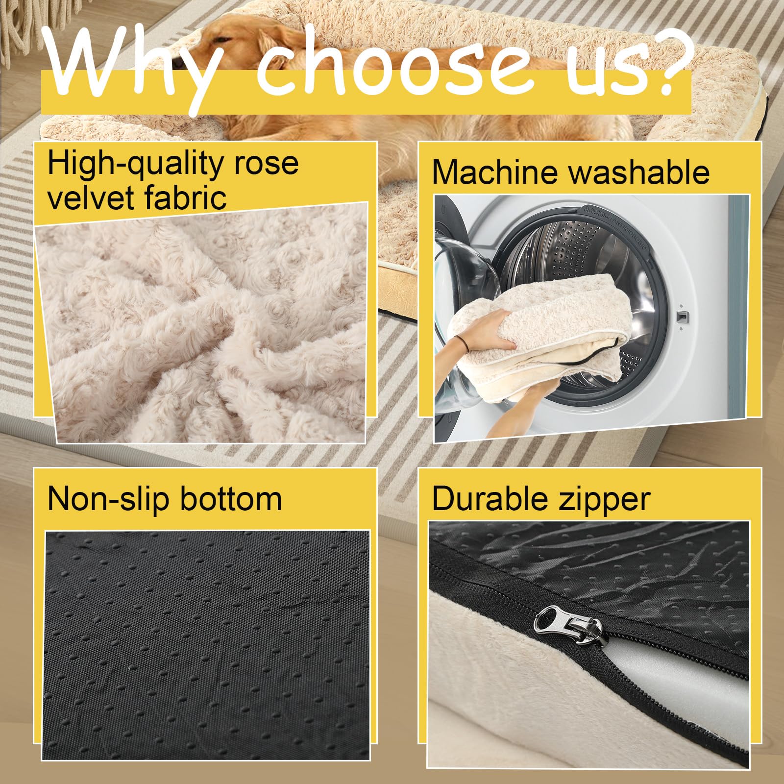 - 【Rose Velvet Fabric】The special feature of this big dog bed is the rose velvet fabric on its surface. Compared with ordinary fabrics, rose velvet fabric has a more delicate touch, and it feels like stroking swan feathers. Pets lying on it can effectively relieve anxiety. In addition, the fabric material is gentle and friendly for pets' noses and skin.