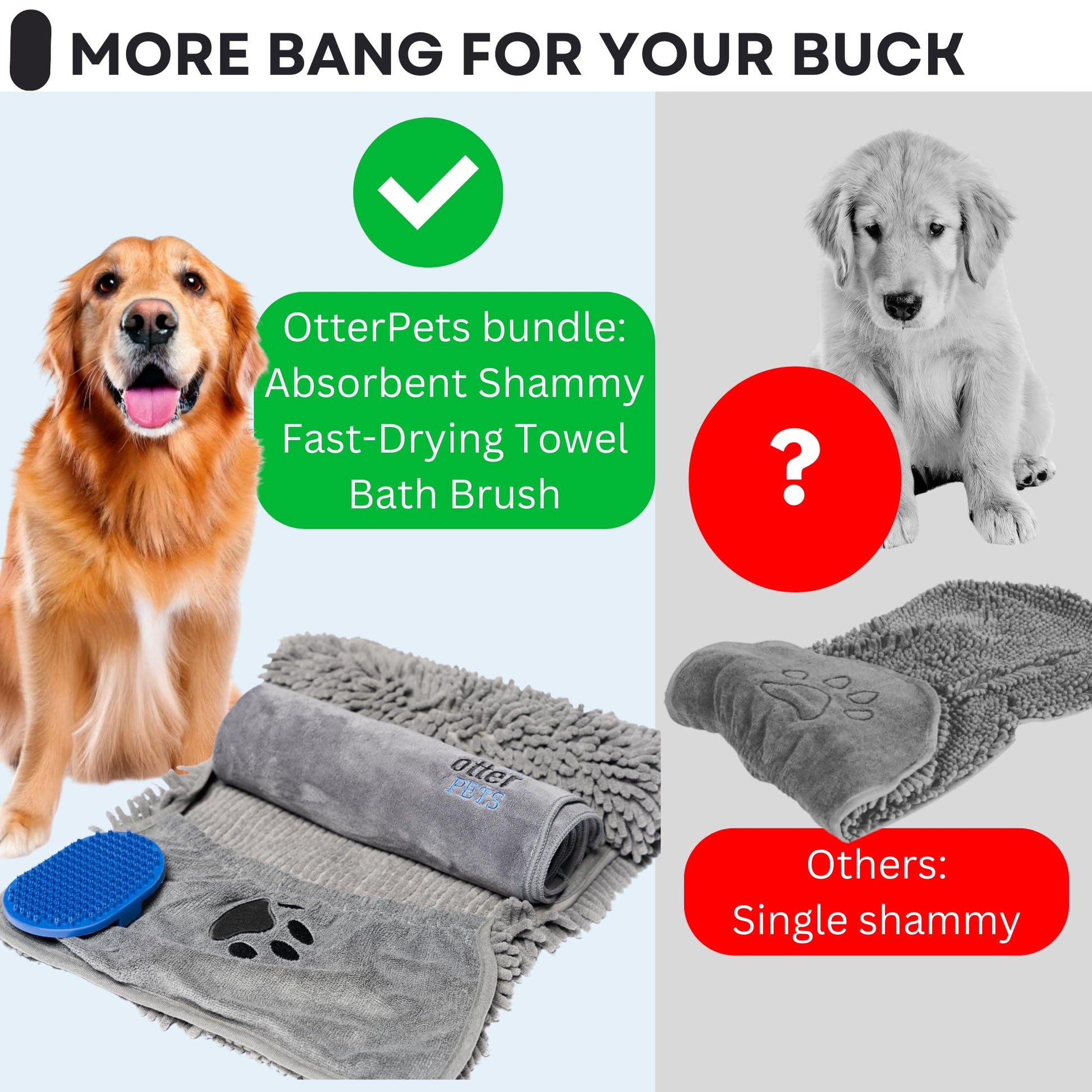 OtterPets 3 Piece Set: 2 Dog Towels and Dog Bath Brush. Dog Shammy and Microfiber Dog Towel. Super Absorbent Towels, Dog Bath Supplies, Dog Scrubber for Bath