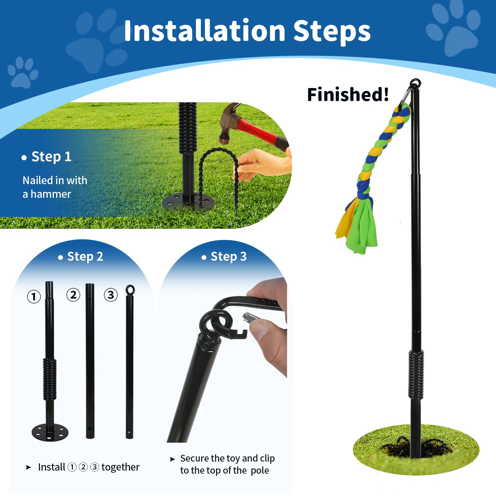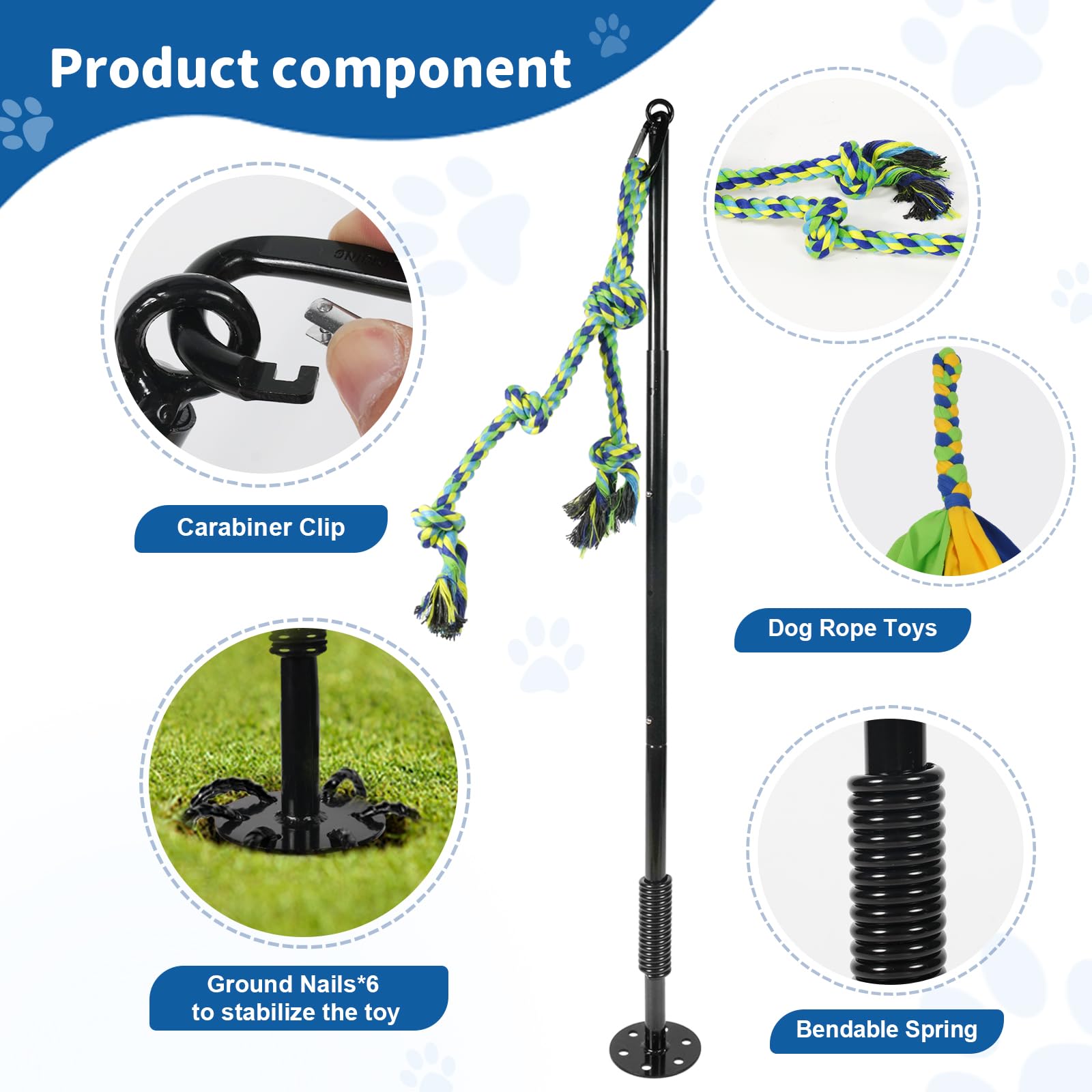 • Dog Tether Toy:The tug toy for dogs with 2 replacement dog rope toys.Unlike bungee tug toys that require trees, our outdoor dog toys only need to find a lawn and install the toy on it. In addition, it can also be used with dog tie out cable to alleviate dog boredom and let your dog enjoy fun of solo play