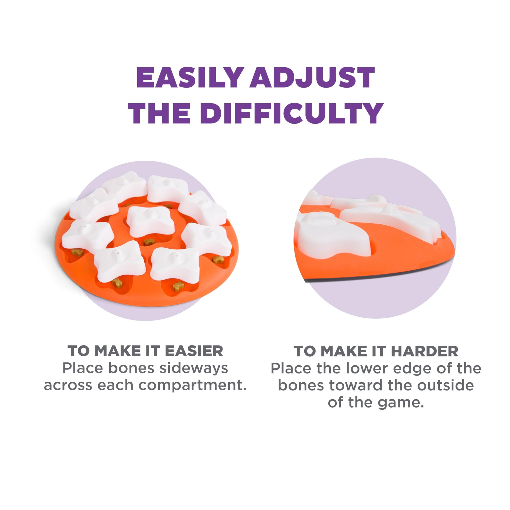 Details: The Nina Ottosson by Outward Hound Dog Smart interactive dog puzzle is a fun way to introduce dog puzzles to your pup and get them excited about problem-solving games! This Level 1 Beginner dog treat puzzle keeps dogs busy with mentally stimulating treat challenges that activate your dog's senses and tap into their natural instincts to hunt and forage for food. As a result, our dog enrichment toys provide mental and physical exercise, help relieve stress, and reduce boredom for happier, healthier pups. Great for small, medium, and large dogs, the Dog Smart dog puzzle features nine treat-hiding compartments you can fill with your pup's favorite dog treats to motivate them to solve the puzzle. Watch your dog use their brain to sniff out the treats, then paw and nudge the bones to uncover the hidden rewards! Since all dogs are unique, you can vary the level of difficulty of this dog food puzzle to meet your dog's problem-solving ability, with multiple ways to make it easier or harder for your pet. Moreover, this dog treat puzzle is easy to clean and made from food safe composite materials that are BPA, PVC, lead, and phthalate-free for your convenience and peace of mind. PLAY BY THE RULES – SAFETY & CARE: When choosing a toy, make sure to choose an appropriate size/style/level for your dog. No toy or game is indestructible. ALWAYS supervise your dog closely, teach your dog how the game/toy works. Do not leave the dog alone with a treat game/toy, do not let the dog chew on the game/toy or pieces. Inspect regularly for damage and remove if broken, or if parts become separated, as serious injury may result. For dogs only, not a children's toy. When empty, store until next supervised use.