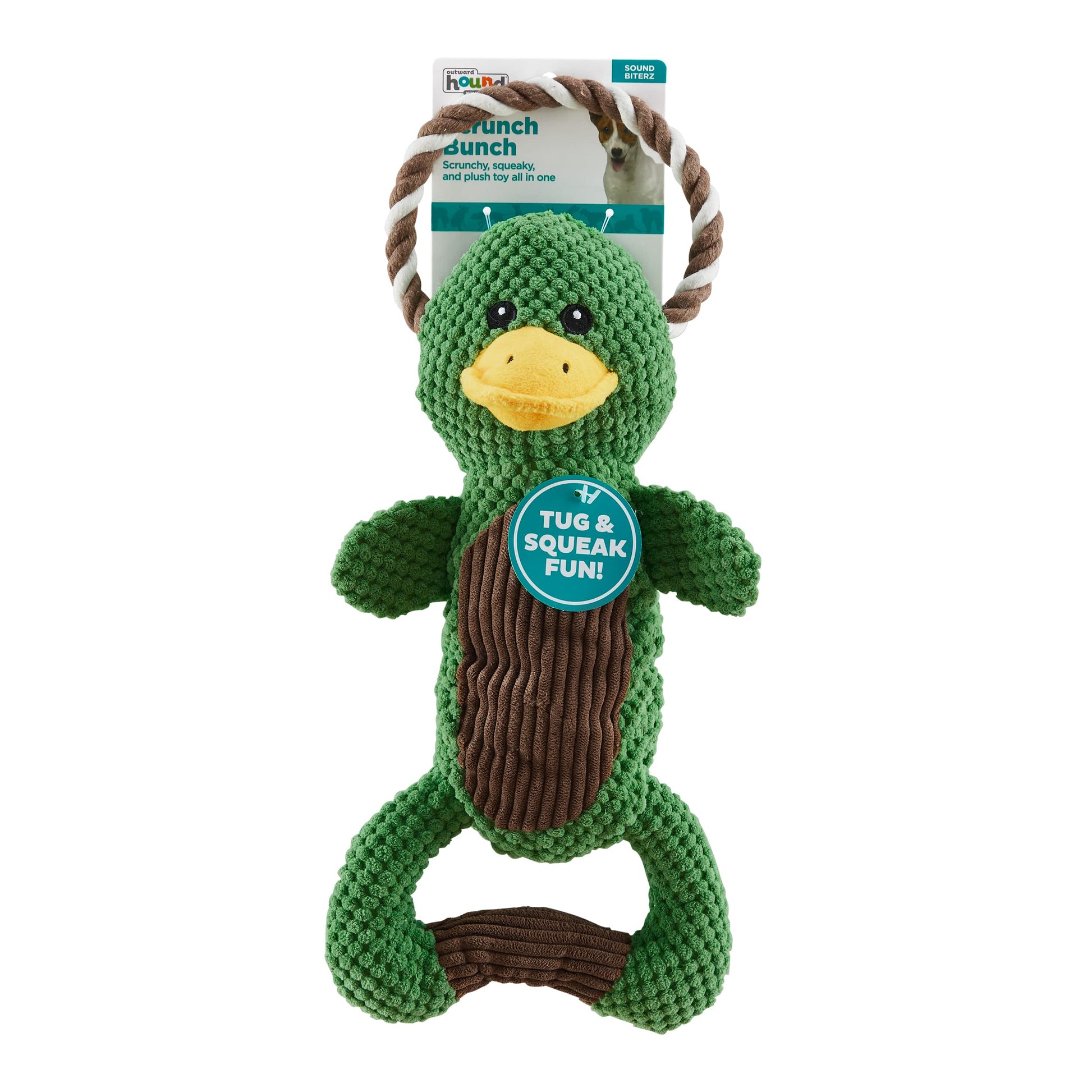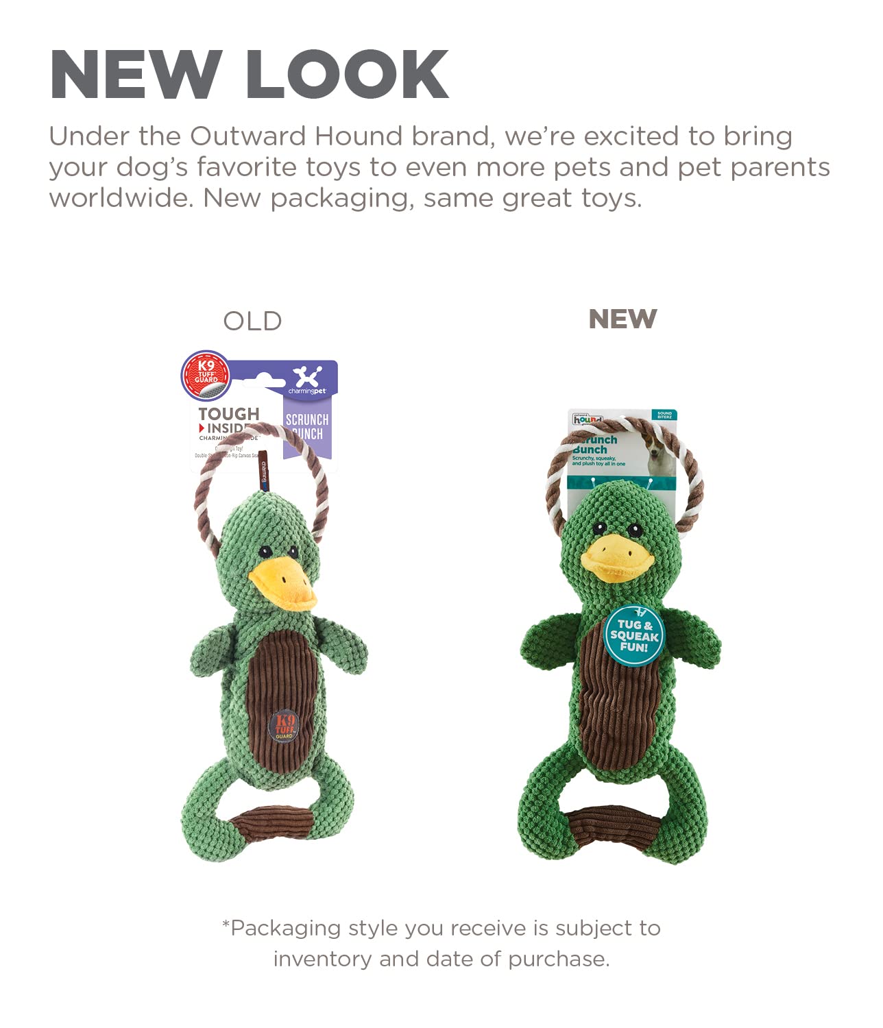 Details: The Outward Hound Scrunch Bunch interactive dog toys are adorable as they are tough! Made with unique K9 Tuff guard technology that includes denier canvas lining, nylon-fused backing, and double stitched seams for added longevity and durability. Designed specifically for tug-of-war games with one rope handle for your dog and one soft, grip handle for you. The floppy body of these cute dog toys makes them ideal for games of fetch as well. Inner crinkle material and multiple tug-activated squeakers add an exciting element for your dog and encourage positive play behavior. Available in different characters. Note, Scrunch Bunch plush dog toys are not meant to be used as chew toys. SAFETY & CARE: When choosing a toy, make sure to choose an appropriate size toy for your dog. No toy is indestructible. ALWAYS supervise your dog when using a toy of any kind. Inspect toys regularly for damage and remove and replace if broken, or if parts become separated, as serious injury may result. Intended for dogs only. Keep out of reach of children.