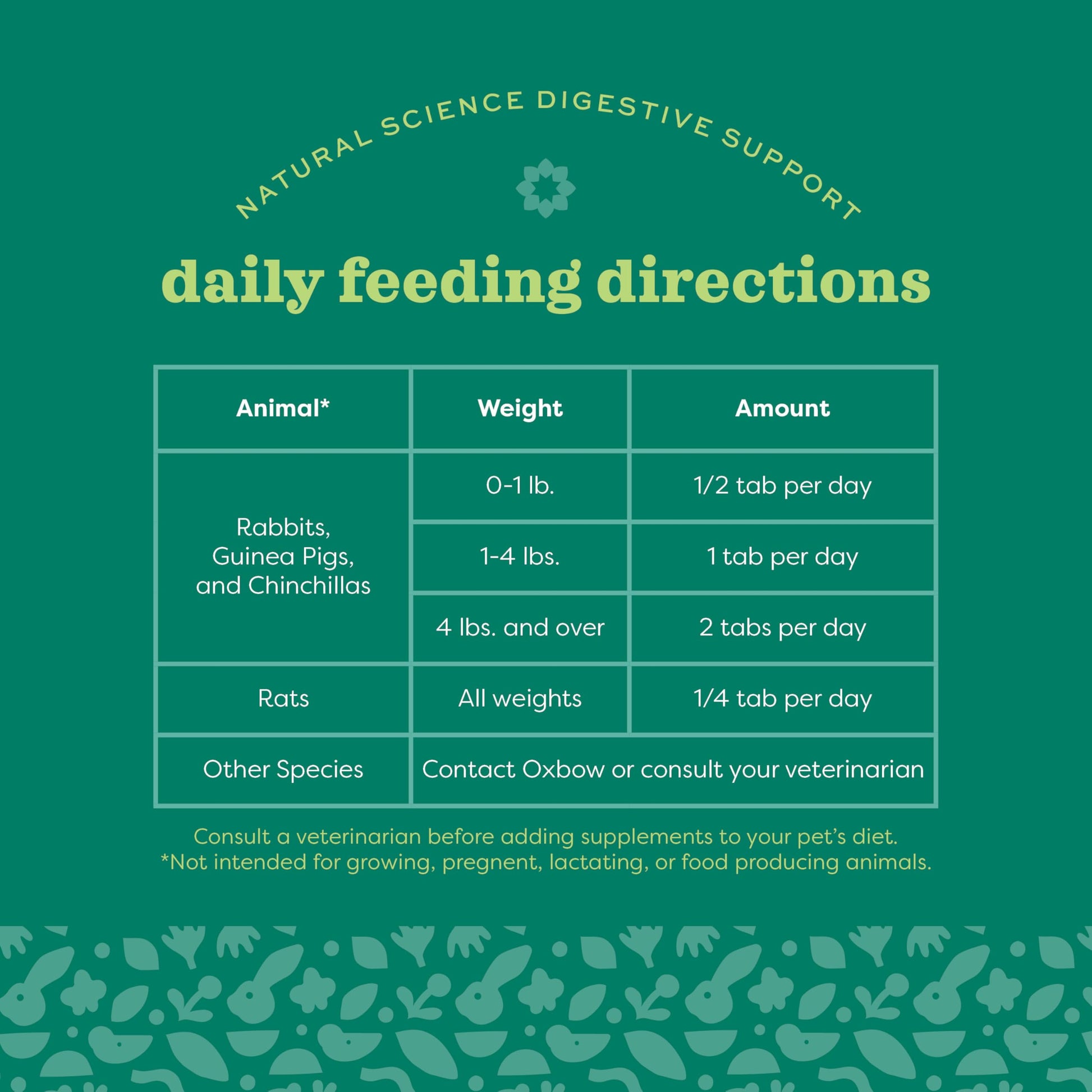 Details: Oxbow Natural Science Digestive Support Supplement for Small Animals is a high-fiber nutritional supplement formulated to promote healthy digestion in herbivorous pets such as rabbits, guinea pigs, and chinchillas. This premium daily supplement is made with a timothy hay base and enriched with natural ingredients including papaya leaf, chicory root, and ginger root, which are known to support gastrointestinal health, ease digestive discomfort, and improve nutrient absorption. The chewable tablet format makes it easy to administer while doubling as a tasty treat, and its natural formula contains no artificial colors or preservatives. Ideal for small animals experiencing GI stasis, bloating, or sensitivity to dietary changes, this supplement is also beneficial during times of stress, recovery, or antibiotic use. By incorporating Oxbow Digestive Support into your pet’s daily routine, you help maintain proper gut motility, balanced intestinal flora, and overall wellness. Suitable for a variety of small animals including rabbits, guinea pigs, chinchillas, and degus, this trusted supplement is designed to be a proactive part of your pet care regimen, helping to ensure consistent digestive health and vitality in every stage of life.