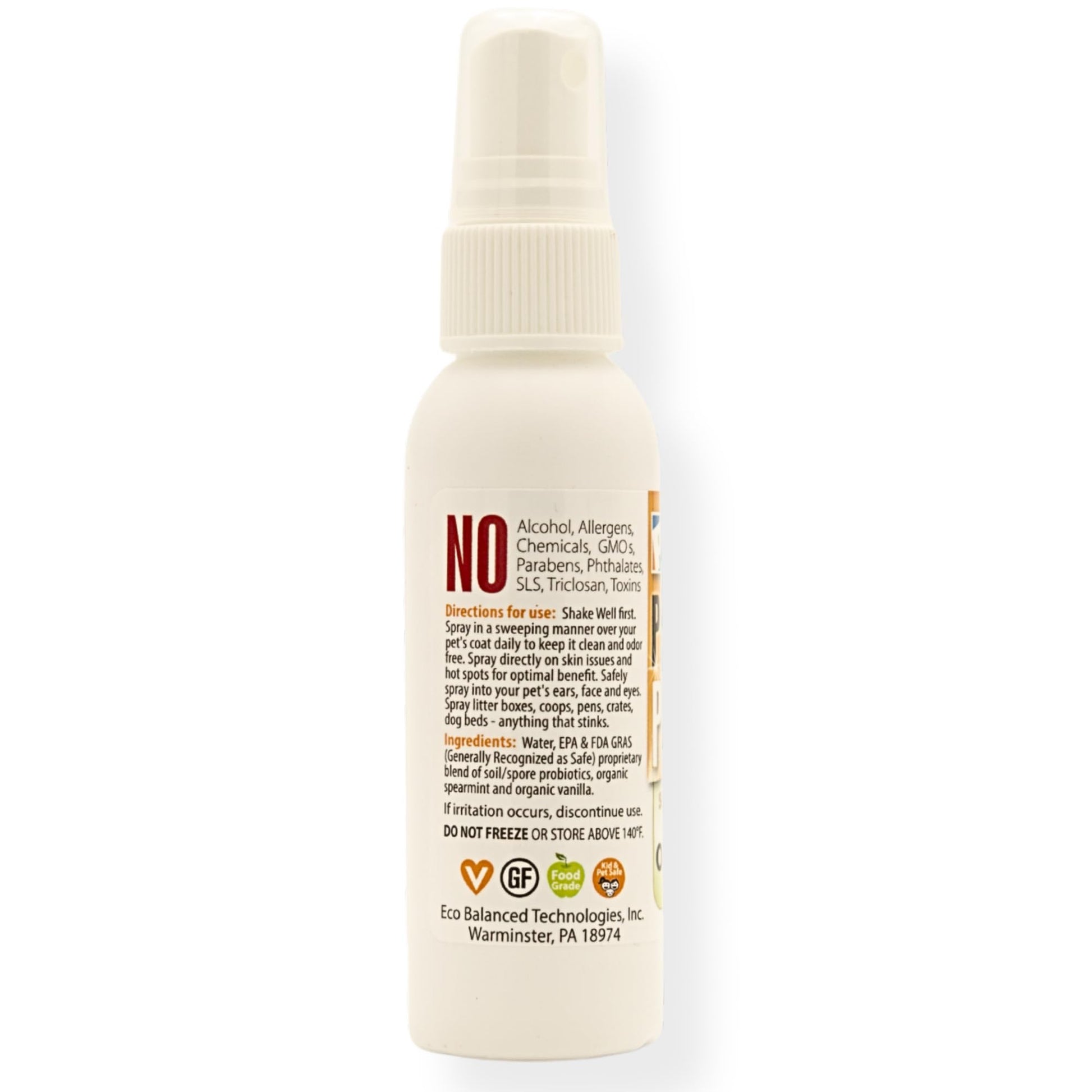 Details: Never leave home without P2 Probiotic Power's Travel Size Pet Odor & Itch Spray! This convenient 2oz bottle fits perfectly in your purse, car, or travel bag, letting you create a healthy probiotic environment wherever you and your pet go. Our hardy spore-based probiotics thrive both on your pet and in its temporary spaces—perfect for hotel rooms, visiting friends, or any new environment your pet encounters. Safely spray sensitive skin, hot spots, and allergies, plus pet carriers, temporary bedding, and any surface with which your pet may come in contact during your adventures. Our non-GMO, biodegradable, non-allergenic formula delivers the same powerful results as our standard 10oz and 16oz Refill sizes—simply spray wherever needed, no rinsing required!