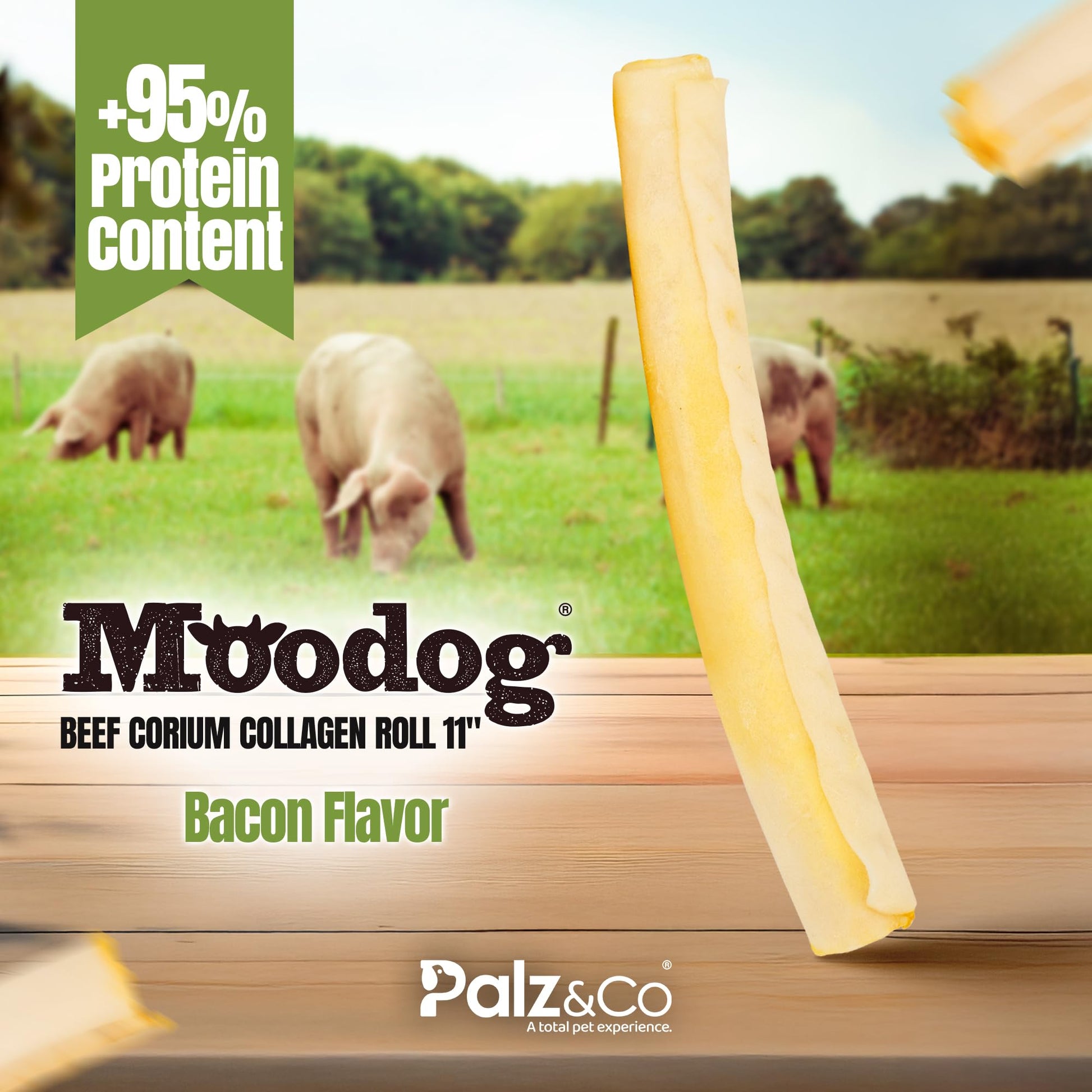 Palz&Co Moodog Beef Corium Collagen Roll 11" Bacon Flavor - 100% Natural Dog Treat, Grain-Free, High Protein, Made in USA, Long Lasting Chew