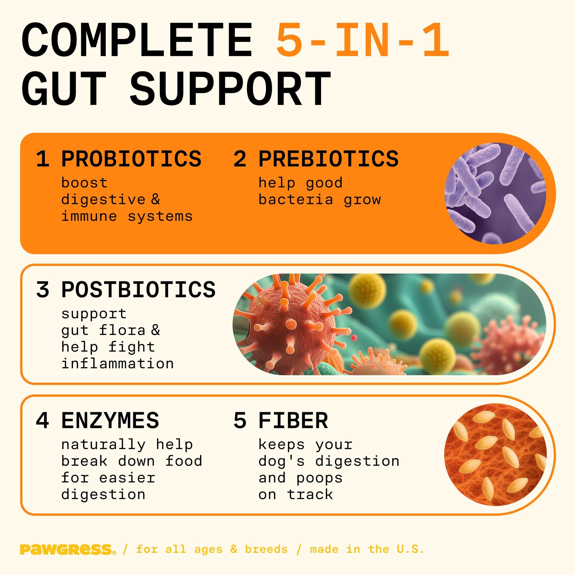 - COMPLETE 5-IN-1 GUT SUPPORT: More than just probiotics—your dog needs all five! Our unique Probiotic Plus Powder combines probiotics, prebiotics, postbiotics, enzymes, and fiber for total digestive health. It helps reduce bloating, soothe sensitive stomachs, strengthen immunity, and support smooth, firm poops—all in one easy daily scoop.