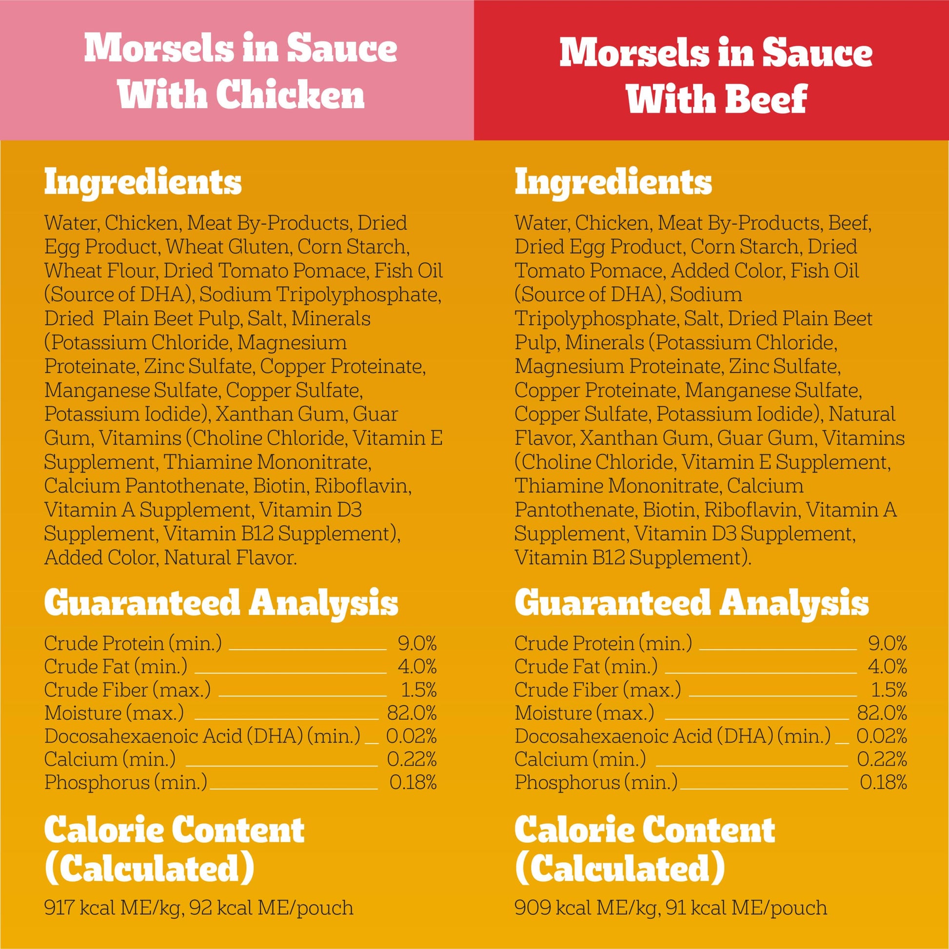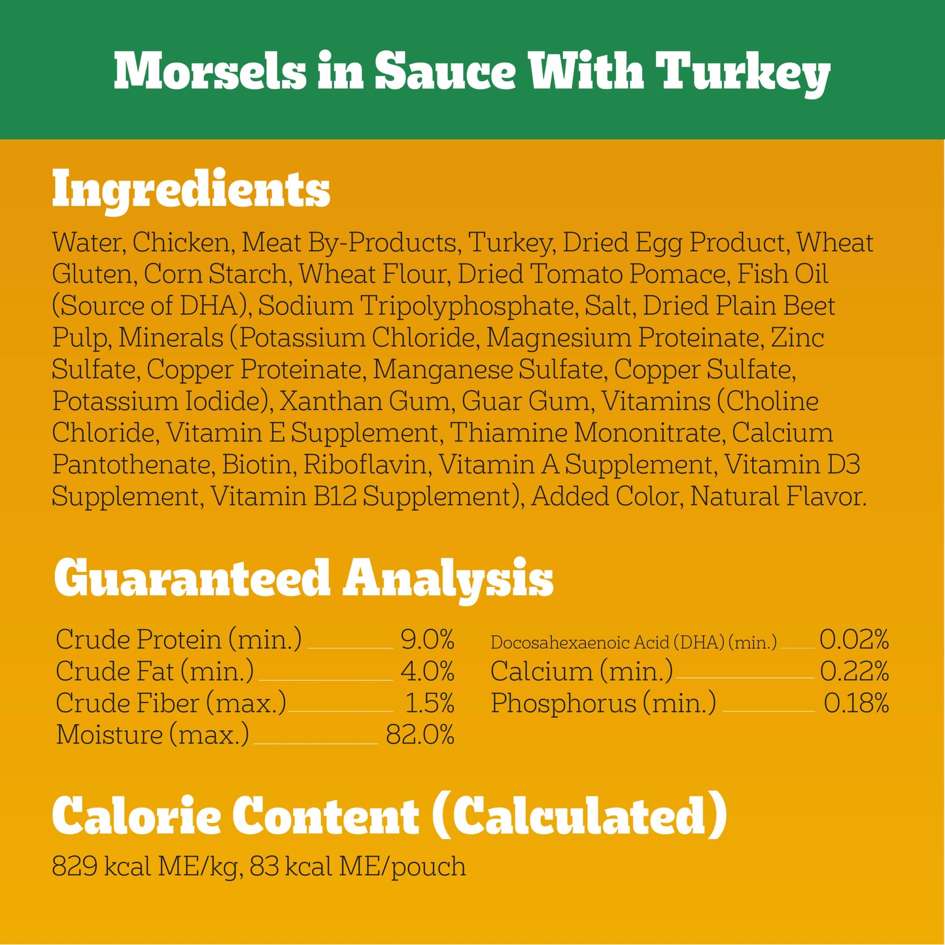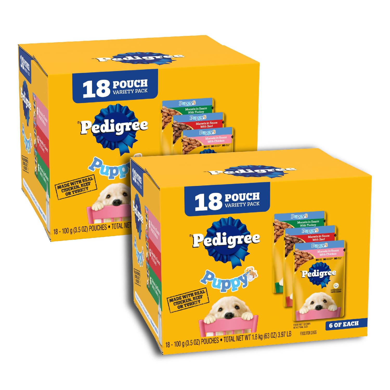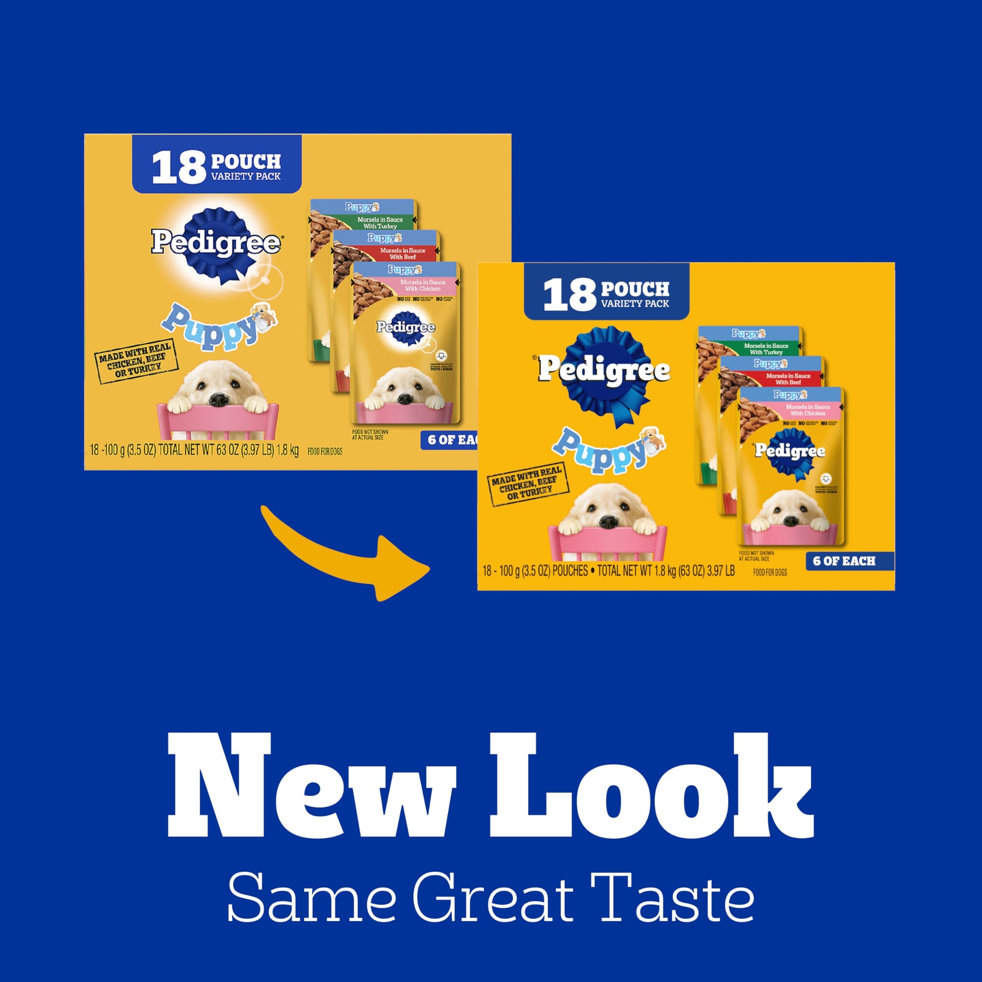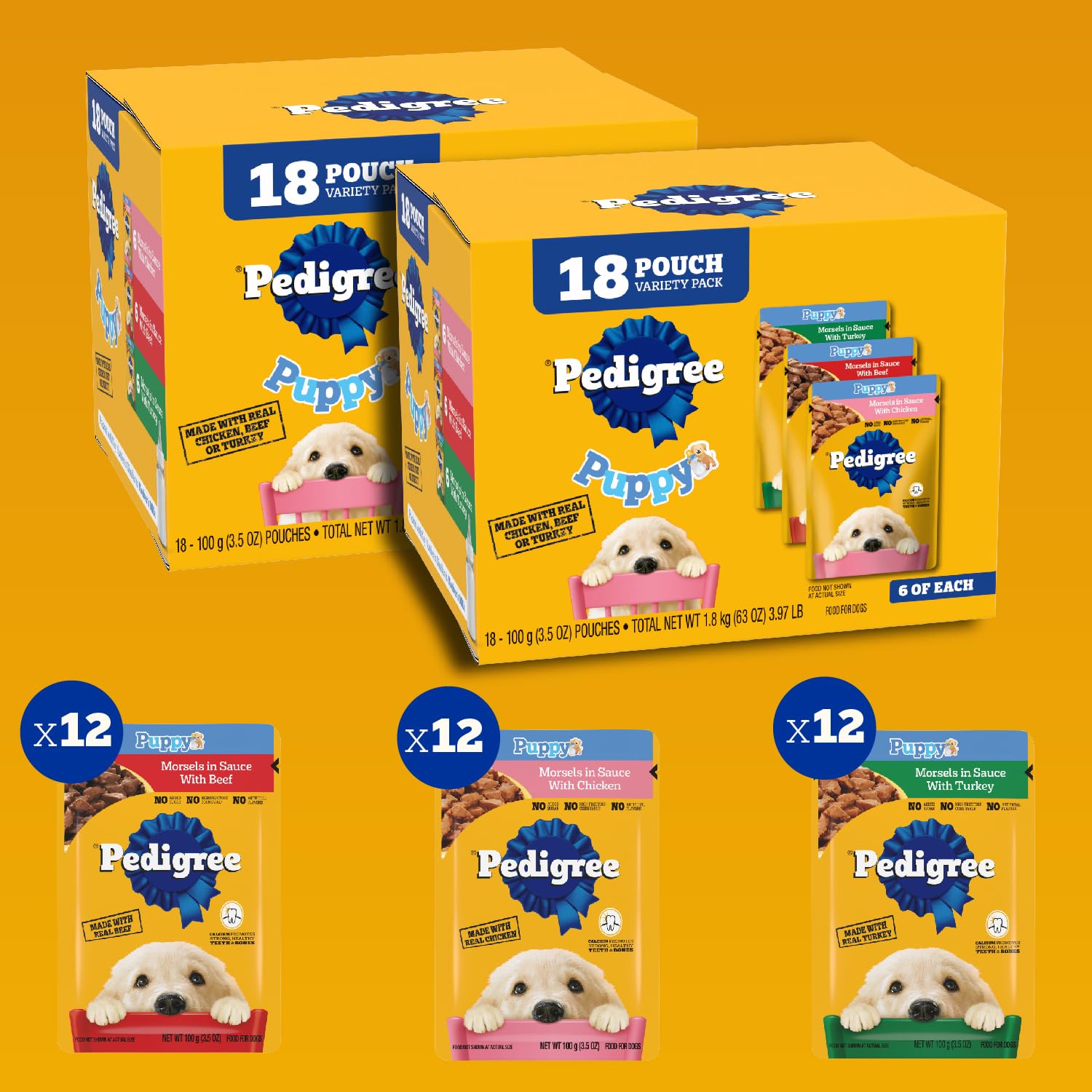 Details: Dogs bring out the good in us. Pedigree brings out the good in them. Express your love for your pup by serving Pedigree Puppy Soft Wet Dog Food, 18-Count Variety Pack. These great-tasting recipes are 100% complete and balanced For Puppies and are made with real chicken, real beef or real turkey, bringing filling and familiar flavors to mealtime. Pedigree Puppy Soft Wet Dog Food 36-Count Variety Pack features three delicious flavors: Morsels in Sauce With Chicken, Morsels in Sauce With Beef, and Morsels in Sauce With Turkey, so your puppy can have favorites to choose from. This wet puppy food is crafted with DHA to support healthy brain development in puppies and contains calcium which supports strong, healthy teeth and bones. With no high fructose corn syrup, artificial flavors, or added sugars, although trace amounts may be present due to potential cross-contact at manufacturing, Pedigree Puppy Soft Wet Dog Food 36-Count Variety Pack shows your dog that you care and want them to have great tasting food.