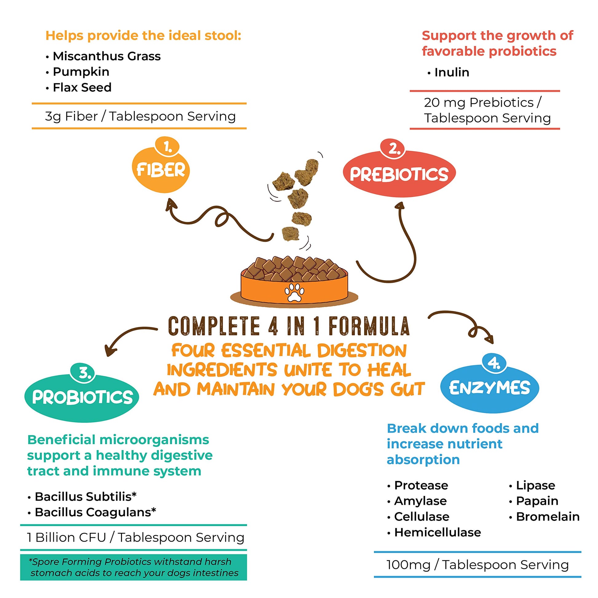 - COMPLETE 4 IN 1 FORMULA: Combines premium Fibers, Prebiotics, Probiotics and Enzymes to supercharge your pet's digestive system. These four building blocks unite to form a high fiber solution that heals and maintains your dog's gut