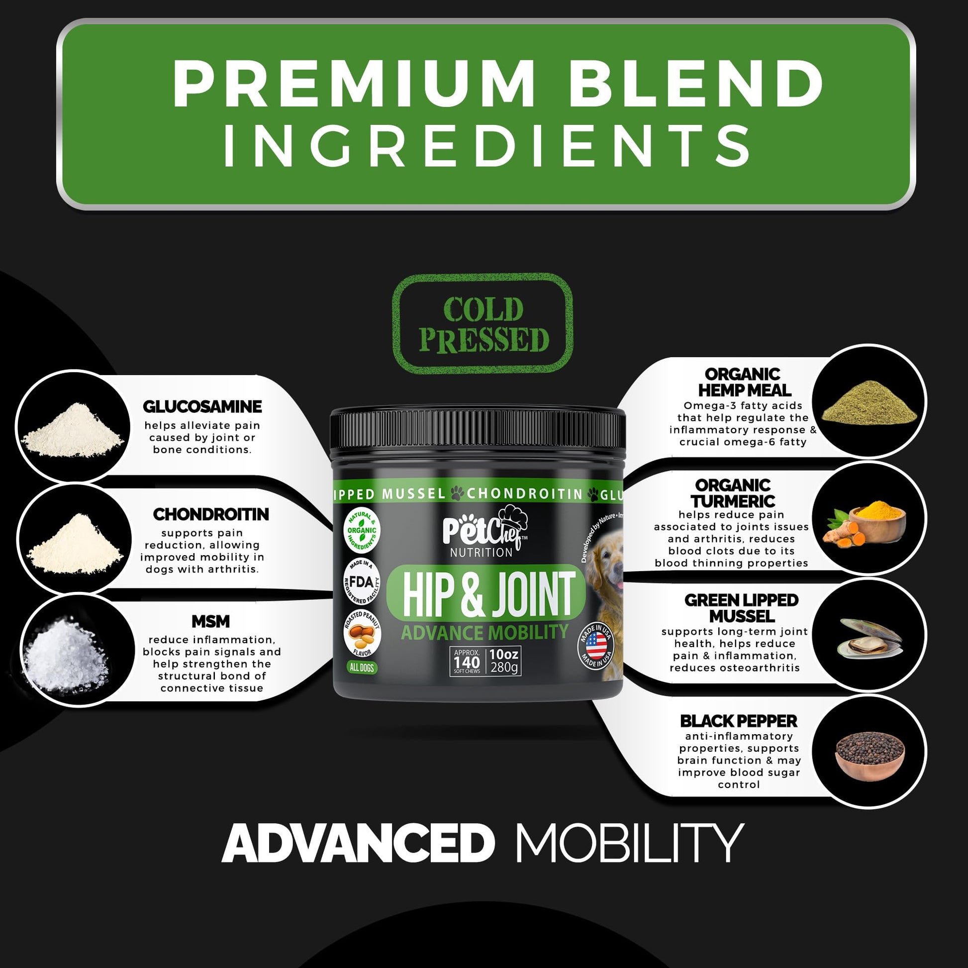 - Keep Your Dog Active and Pain-Free without drugs or harmful chemicals. Fix your dogs hip and joint problem with every bite of this premium soft chew. Pet Chef Dog Hip & Joint Supplement Treats are your best ally to fight arthritis, joint stiffness, and discomfort in dogs. Each soft chew delivers a powerful blend of Glucosamine, Chondroitin, MSM, and Turmeric—ingredients trusted by vets to promote joint health and flexibility. Perfect for aging dogs or active pups needing extra support, our formula helps rebuild cartilage, reduce swelling, and improve mobility so your dog can run, play, and jump like before.