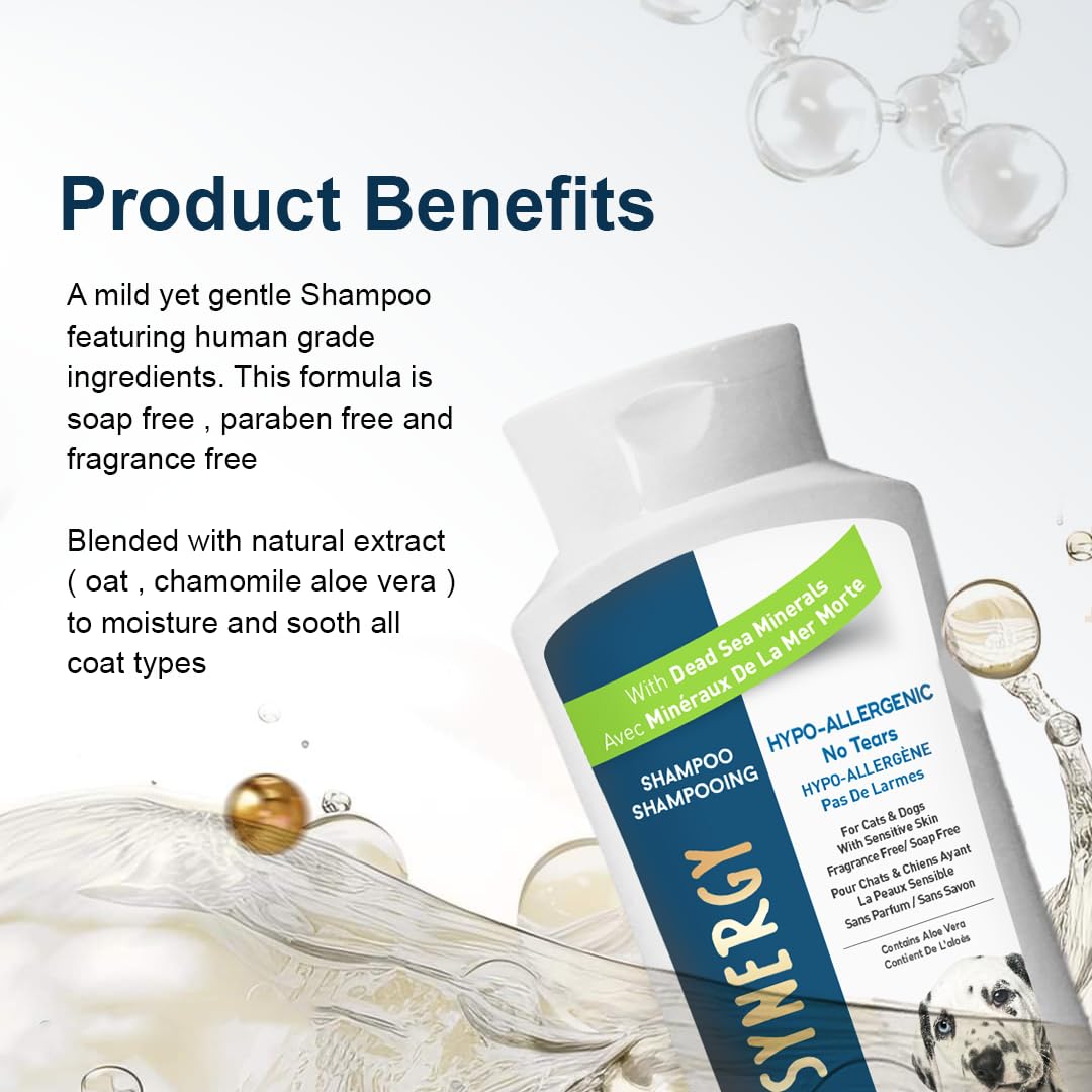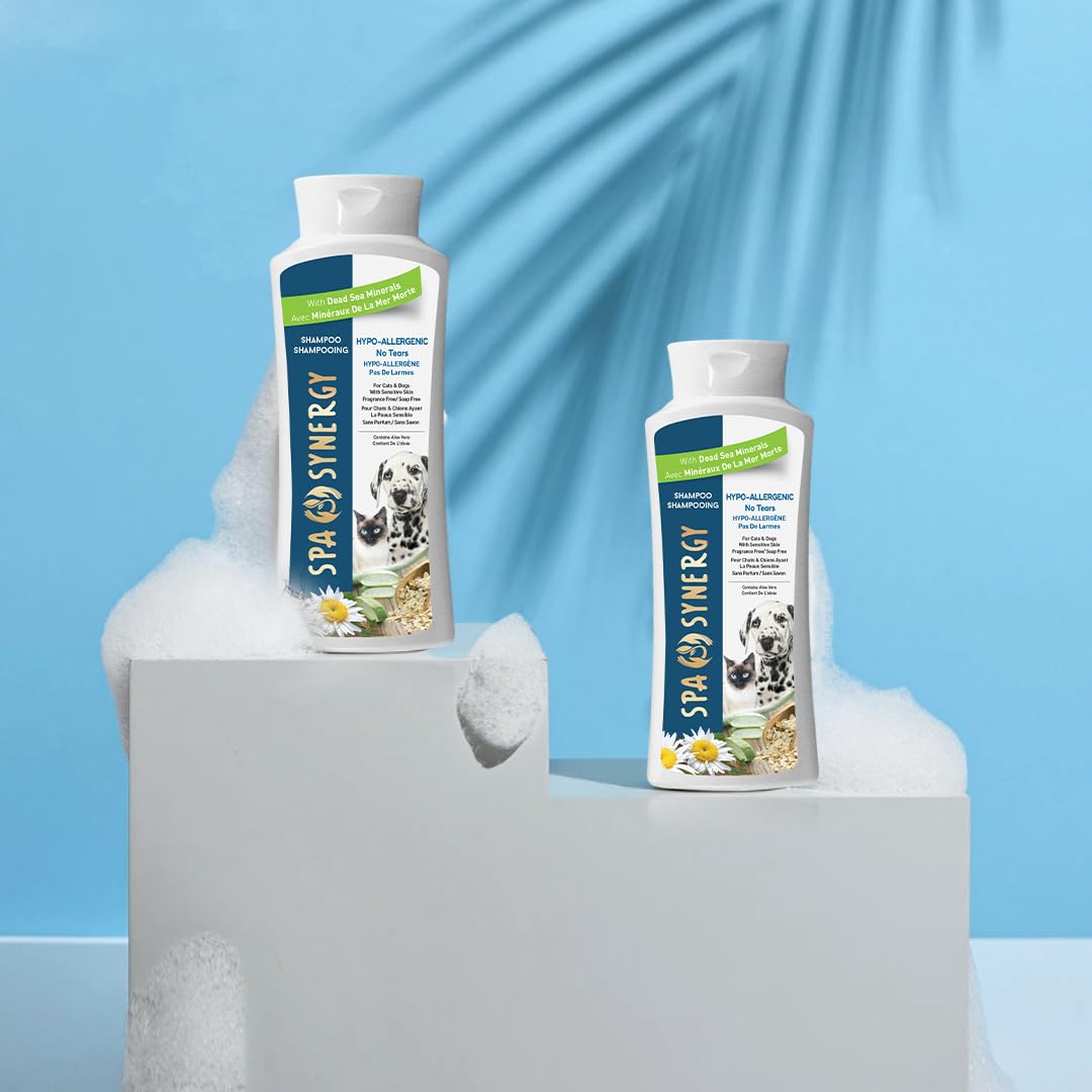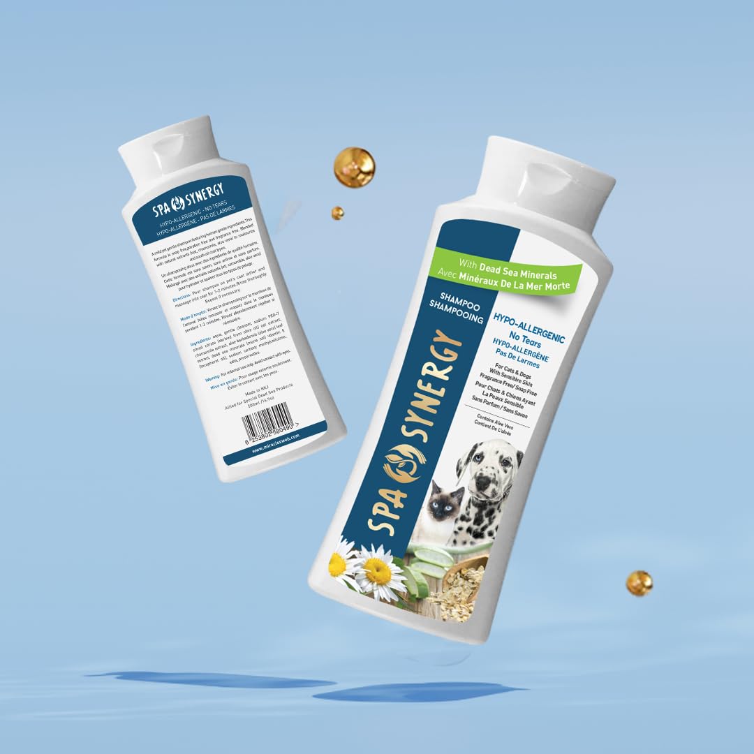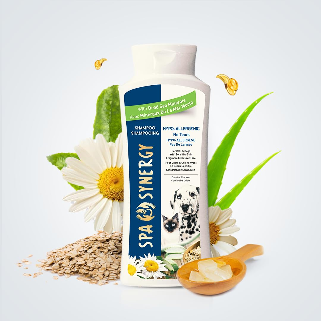 Introducing Spa Synergy Pet Dog Shampoo – where indulgence meets purity for your furry friend's grooming needs. Crafted with care and integrity, our hypo-allergenic formula is the epitome of gentle cleansing, ensuring a tear-free experience that leaves your pet's coat silky, soft, and smelling fresh. Enriched with the nourishing properties of natural Dead Sea minerals and the soothing essence of Aloe Vera, our shampoo provides a luxurious bath time ritual that your pet will love. Say goodbye to irritation and discomfort, as our soap-free and paraben-free formula is designed with your pet's sensitive skin in mind. At Spa Synergy, we prioritize your pet's well-being, which is why our shampoo is fragrance-free, minimizing the risk of allergic reactions and ensuring a truly gentle cleanse. Let your pet bask in the pure goodness of nature, as our formula harnesses the power of Dead Sea minerals and Aloe Vera to promote healthy skin and a glossy, lustrous coat. Formulated with care, our pH-balanced shampoo ensures optimal skin health for your pet, maintaining the natural balance of their delicate skin while providing thorough cleansing. Say goodbye to tears and discomfort during bath time, as our no-tears formula is designed to be gentle on your dog's sensitive skin and eyes. Elevate your pet's grooming routine with Spa Synergy Pet Dog Shampoo – because when it comes to your furry friend, only the finest natural ingredients will do.