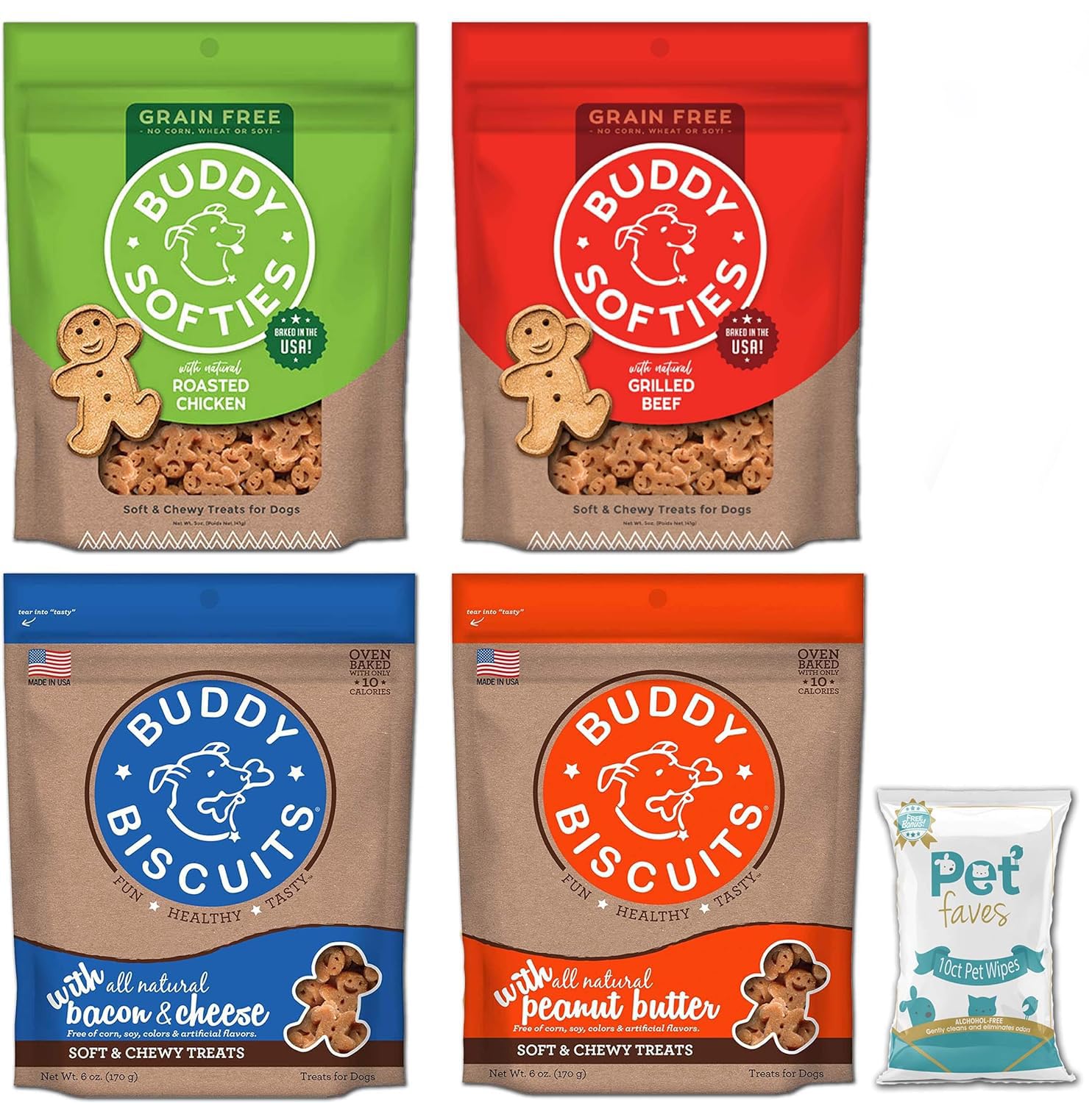- PACKAGE INCLUDE: 1 Buddy Biscuits Soft & Chewy GRAIN FREE Grilled Beef 5 oz, 1 GRAIN FREE Roasted Chicken 5 oz, 1 HEALTHY WHOLE GRAIN Bacon & Cheese 6 oz, 1 HEALTHY WHOLE GRAIN Peanut Butter 6 oz and 10ct Pet Faves wipes.