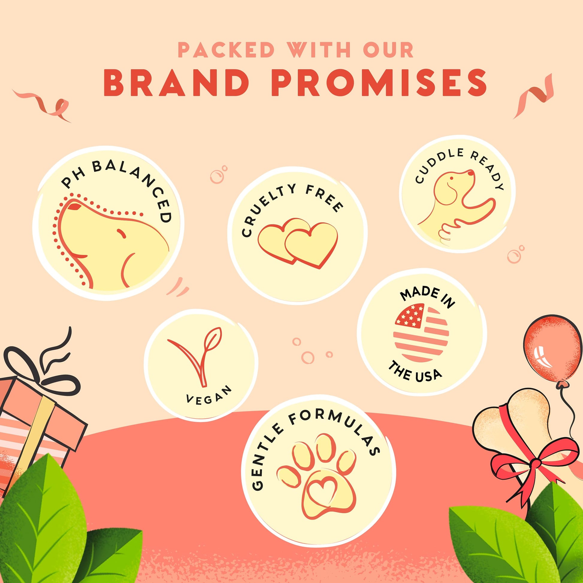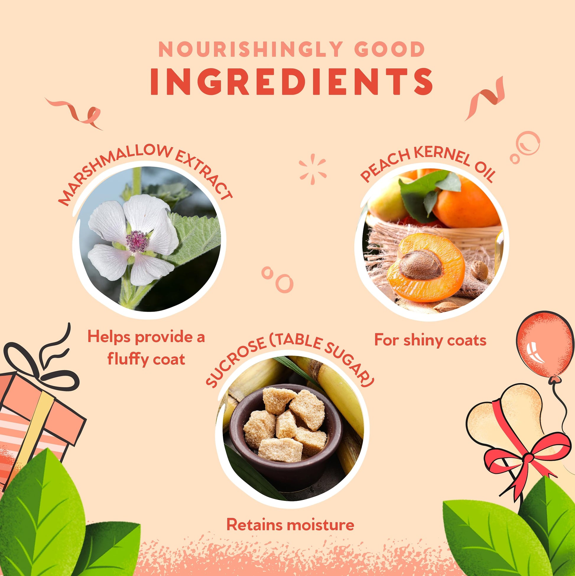 WITH NATURAL OILS & EXTRACTS: Our Birthday Sparkle Shampoo is packed with aloe vera and vegetable protein which gently soothe and moisturize all skin types. Marshmallow extract and peach kernel oil help hydrate and provide a shiny coat.