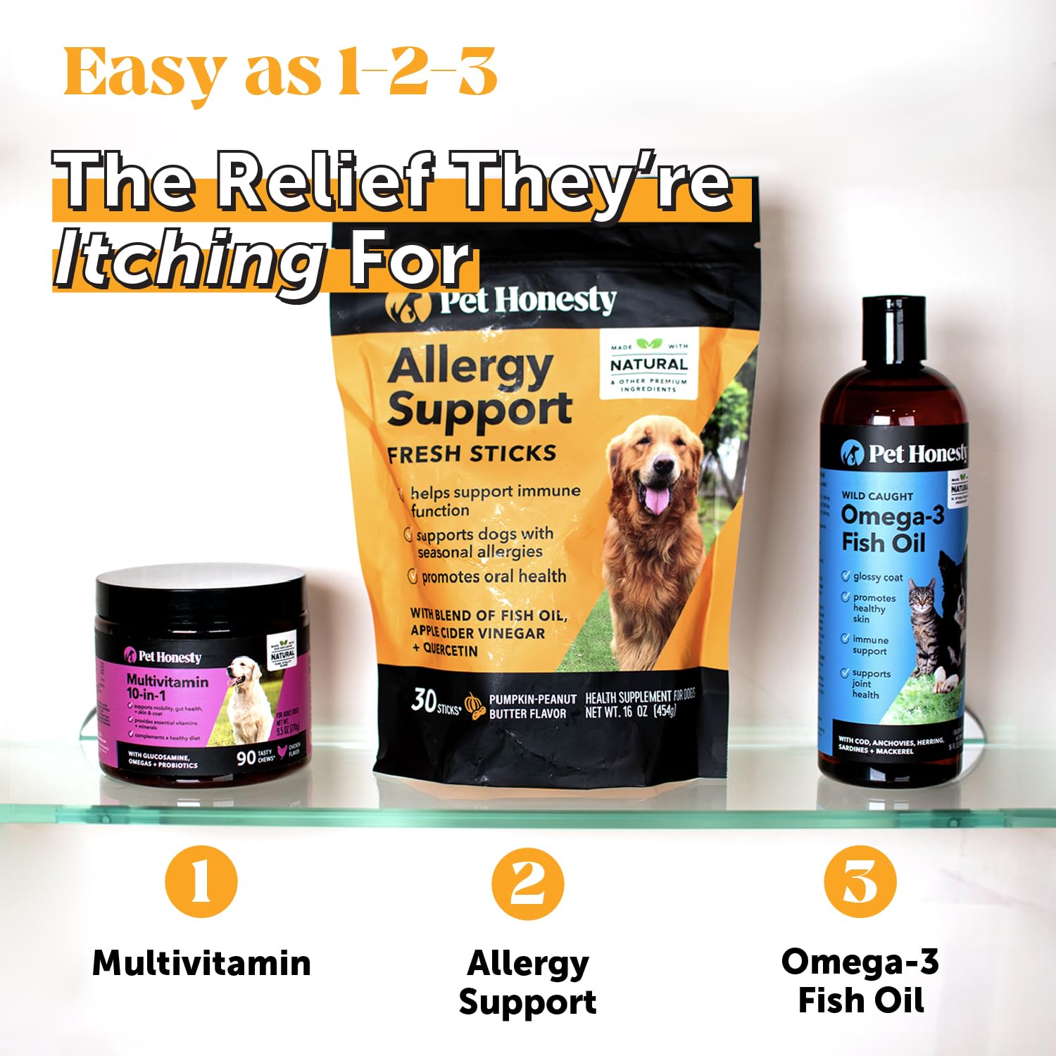 - Made with Natural Ingredients Like Colostrum, Fish Oil, and Apple Cider Vinegar: Pet Honesty's Allergy Support Fresh Sticks are a natural choice for managing allergies and promoting dental health. These sticks are formulated with ingredients that not only support healthy teeth and gums but also help manage seasonal allergies and boost overall immune health.