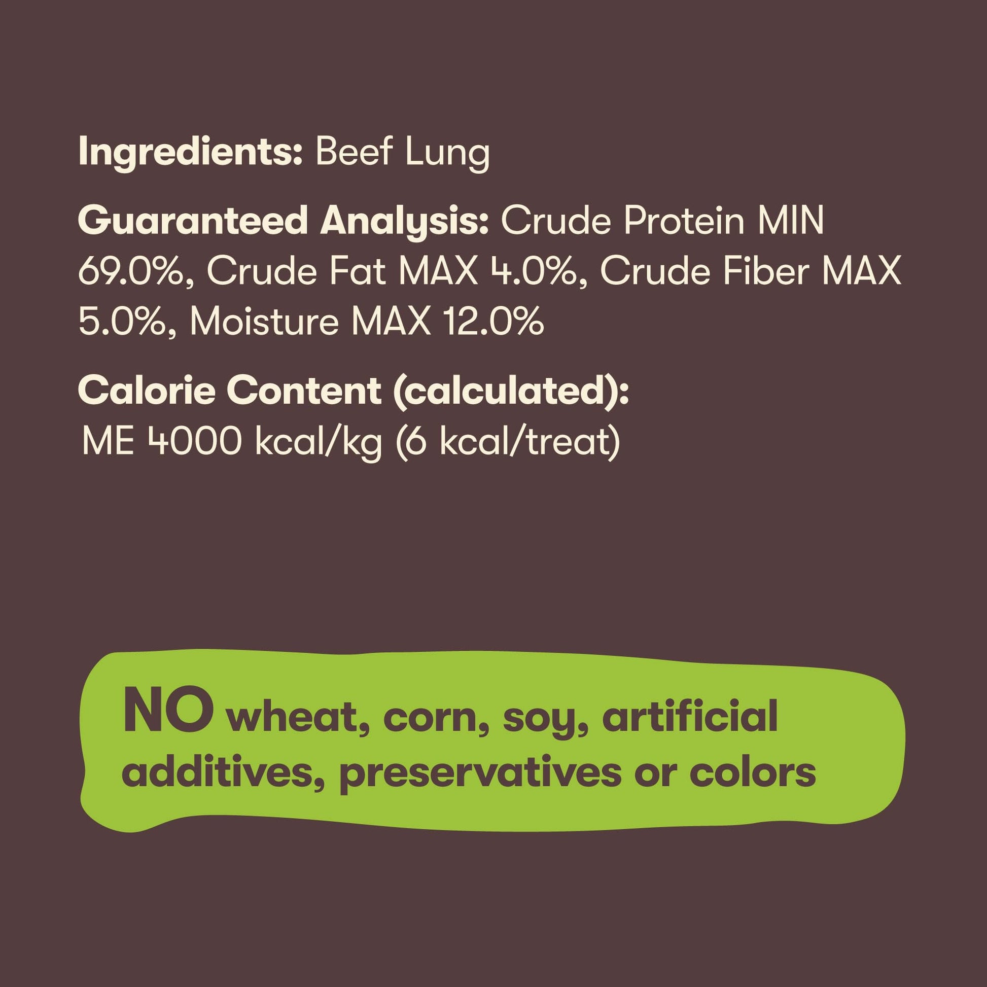 Details: Pet 'n Shape Beef Lung Bites are 100% natural and proudly made and sourced in the USA. This lightweight, crunchy, mouth-watering treat is ideal for playful puppies, adults and seniors of all sizes and may be broken into smaller pieces to use as a training tool. Pet 'n Shape Beef Lung Bites contain no artificial additives, colors, or preservatives and are free of wheat, corn, and soy. Resealable packaging locks in freshness and is ideal for easy storage.