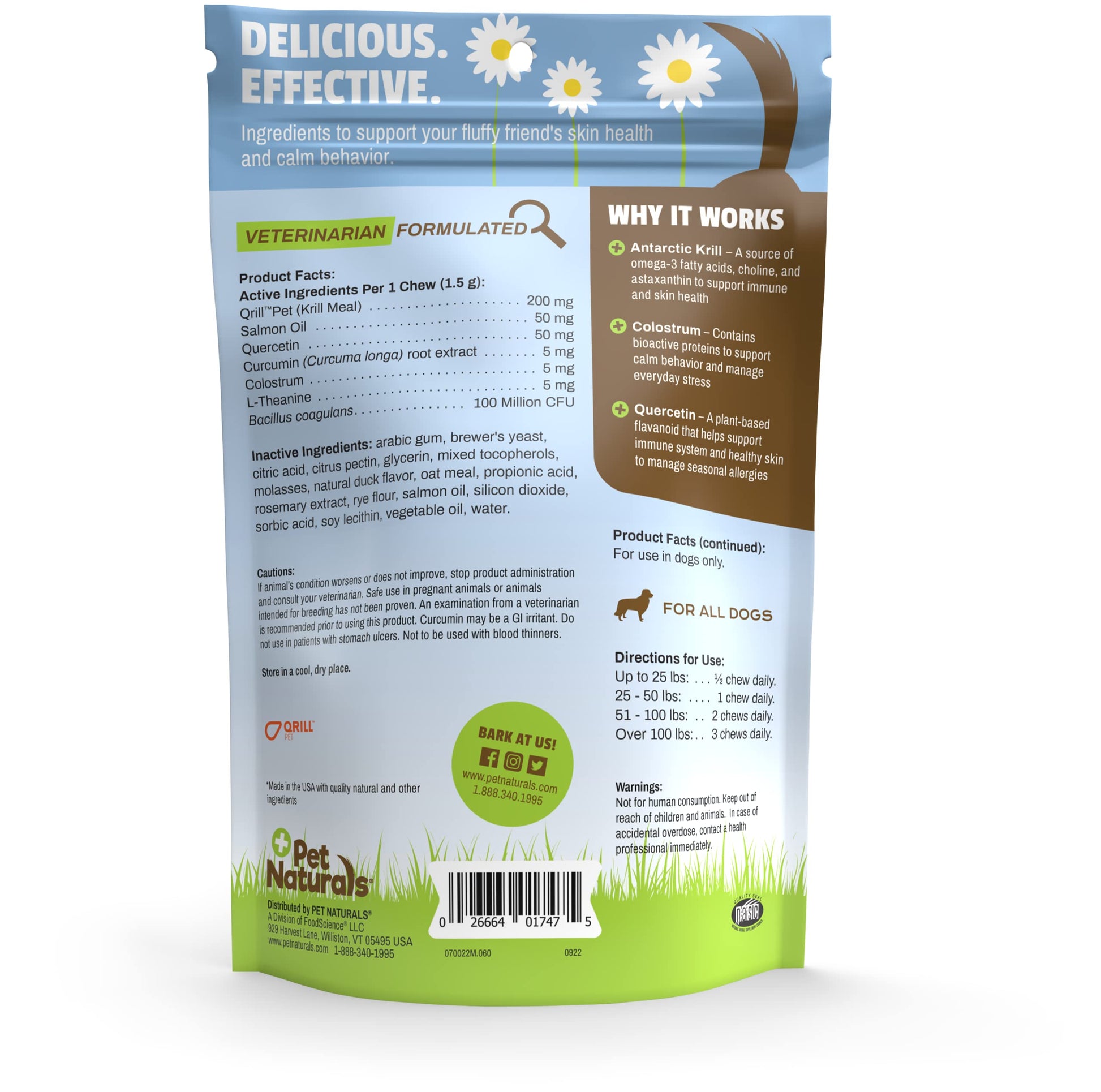 Trusted Ingredients: Allergy Plus Calming is made with salmon oil & Antarctic krill to nourish dry, itchy skin; quercetin & curcumin to support immunity & healthy inflammation; Colostrum & l-theanine to promote calm behavior; and added probiotics for gut health.