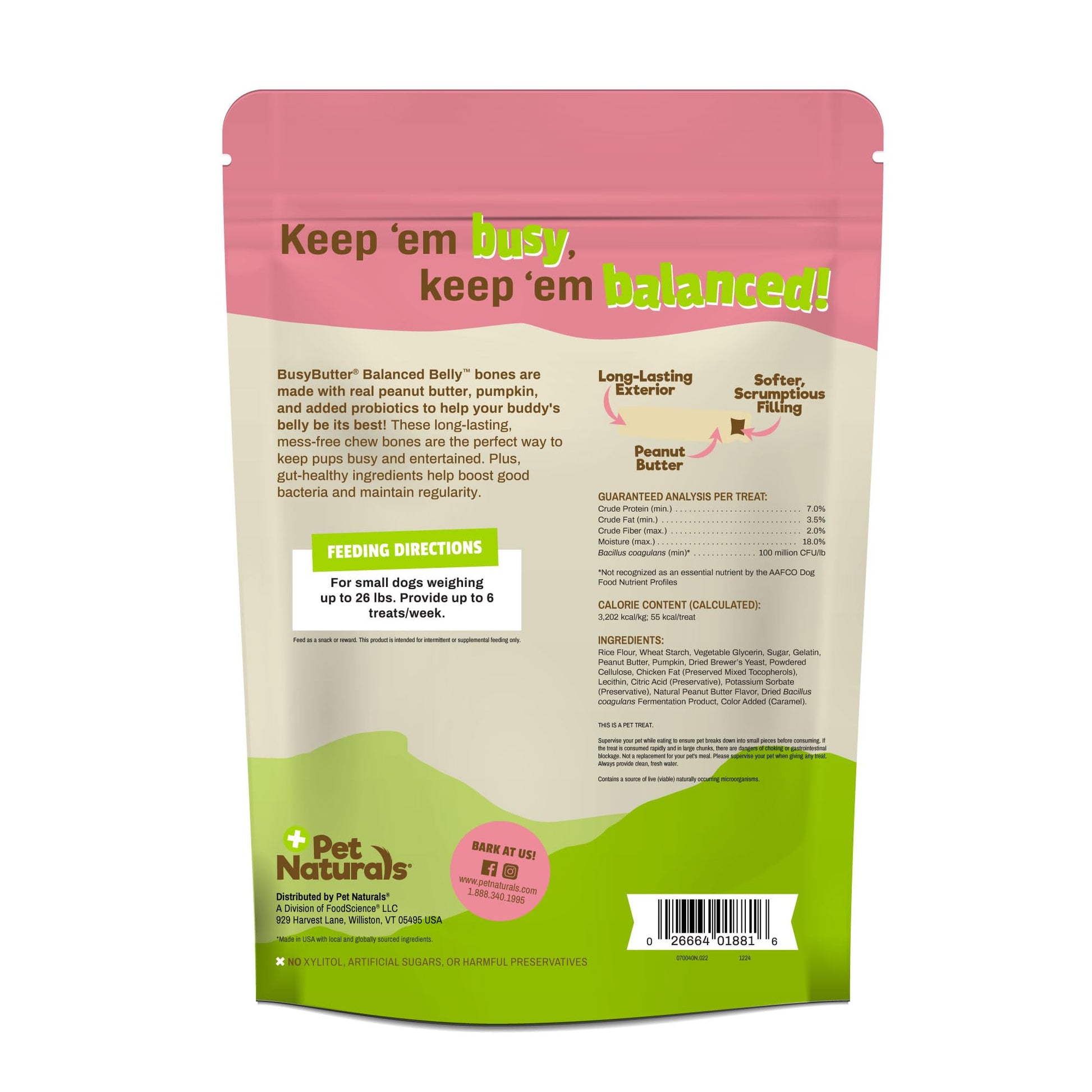 Details: BusyButter Balanced Belly Bones are the ultimate long-lasting peanut butter dog chew. They're crafted with real peanut butter for a safe and delicious treat your pup will love. These rawhide-free chews are mess-free and easily digestible, making them a worry-free option that’s gentle on your dog's stomach. Formulated with pumpkin and probiotics, these peanut butter chew bones can help support healthy digestion, stool quality, and overall gut health. Peanut-butter-filled bones are designed for enrichment and available in two sizes to provide a satisfying chewing experience for small, medium, and large dogs. They help to ease boredom, fight stress, and keep your dog happily engaged. They're the perfect combination of taste, healthy ingredients, and fun for your pup. Treat your dog to a better chew with these peanut butter delights that are as good for their belly as they are for their mood! Feed as a snack or reward. These bones are intended for intermittent or supplemental feeding only. Always supervise pets while eating to make sure the treat is chewed, not gobbled, and be sure to always provide fresh, clean water! BusyButter Balanced Belly Bones are made in the USA with the highest safety and quality standards.