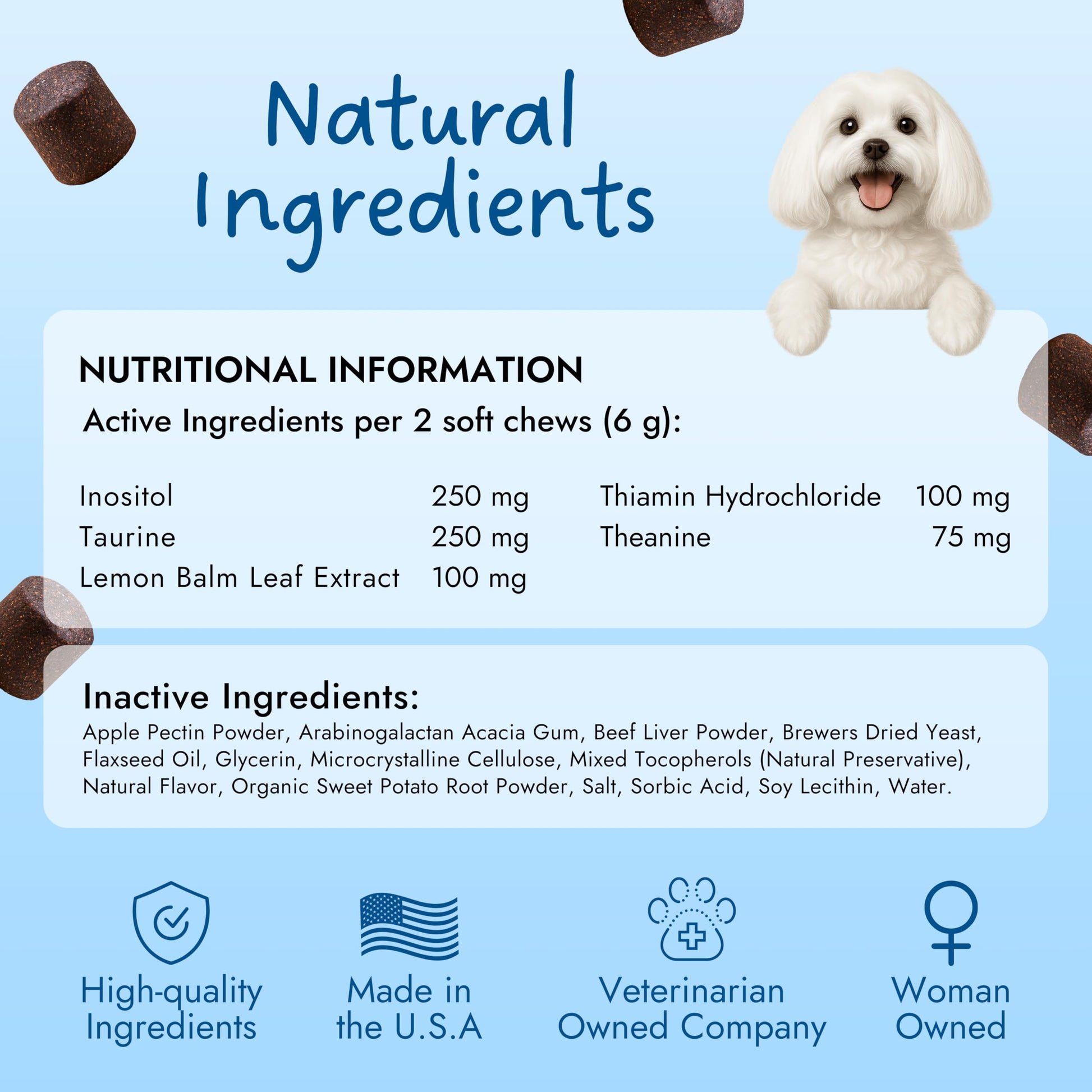 VETERINARIAN OPERATED AND FORMULATED INGREDIENTS FOR STRESSED DOGS - Our dog calming chews contain a carefully selected blend of taurine, inositol, theanine, thiamin, and lemon balm. These ingredients work together to support relaxation and provide dog anxiety relief for nervous dogs. Taurine and theanine are known for their calming effects, while inositol and thiamin help reduce anxiety and promote emotional balance. This potent combination makes these chews a must-have in your dog supplies.