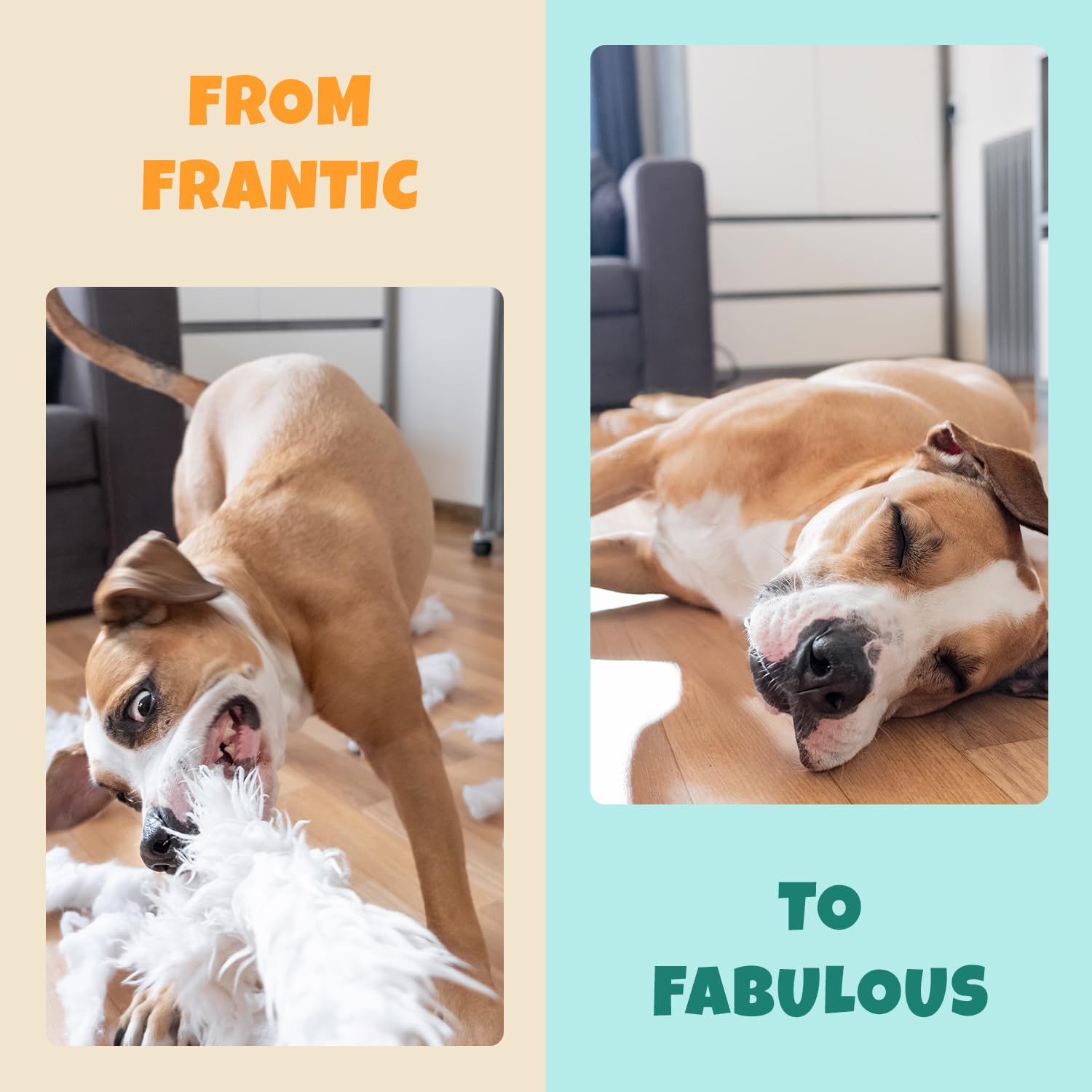 • From Frantic to Fabulous - Our calming supplement soothes stressed-out pups. Whether it's the vet, fireworks, or car rides, our treats work to calm anxiety and restore composure in your dog, transforming frantic behavior into tranquility.
