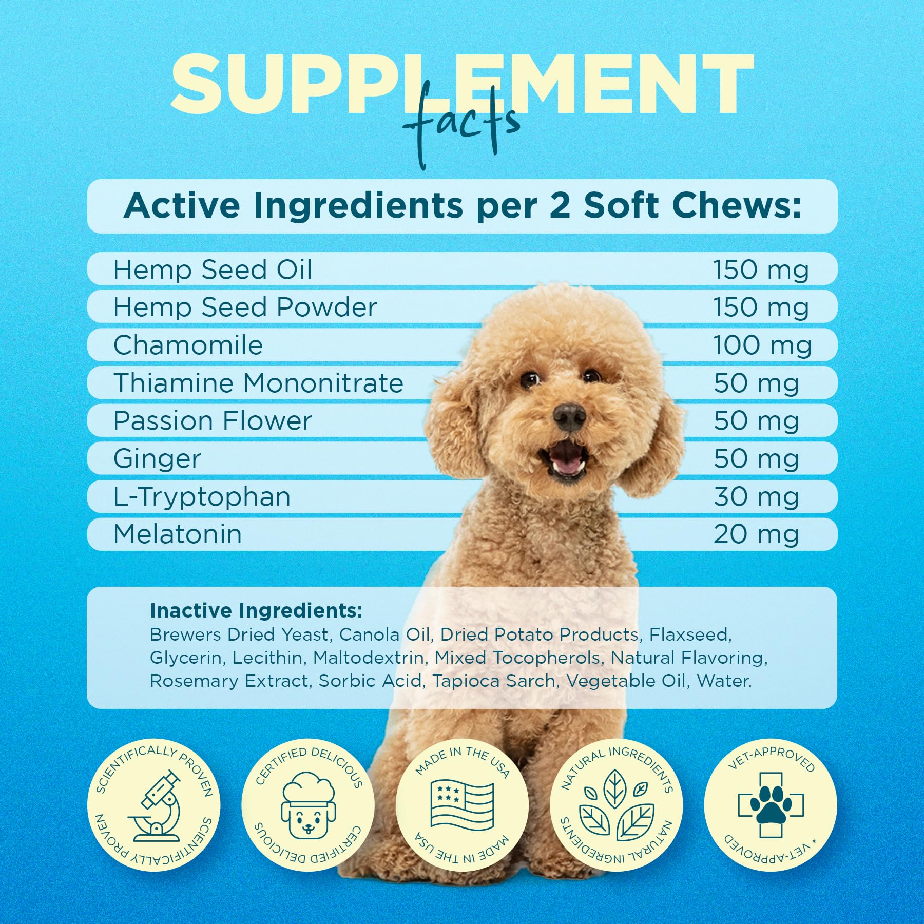 - Non-Drowsy Calming – These soft chews deliver relaxing support without sedation, helping dogs stay calm yet alert and playful. Made with safe, food-grade ingredients you can trust.