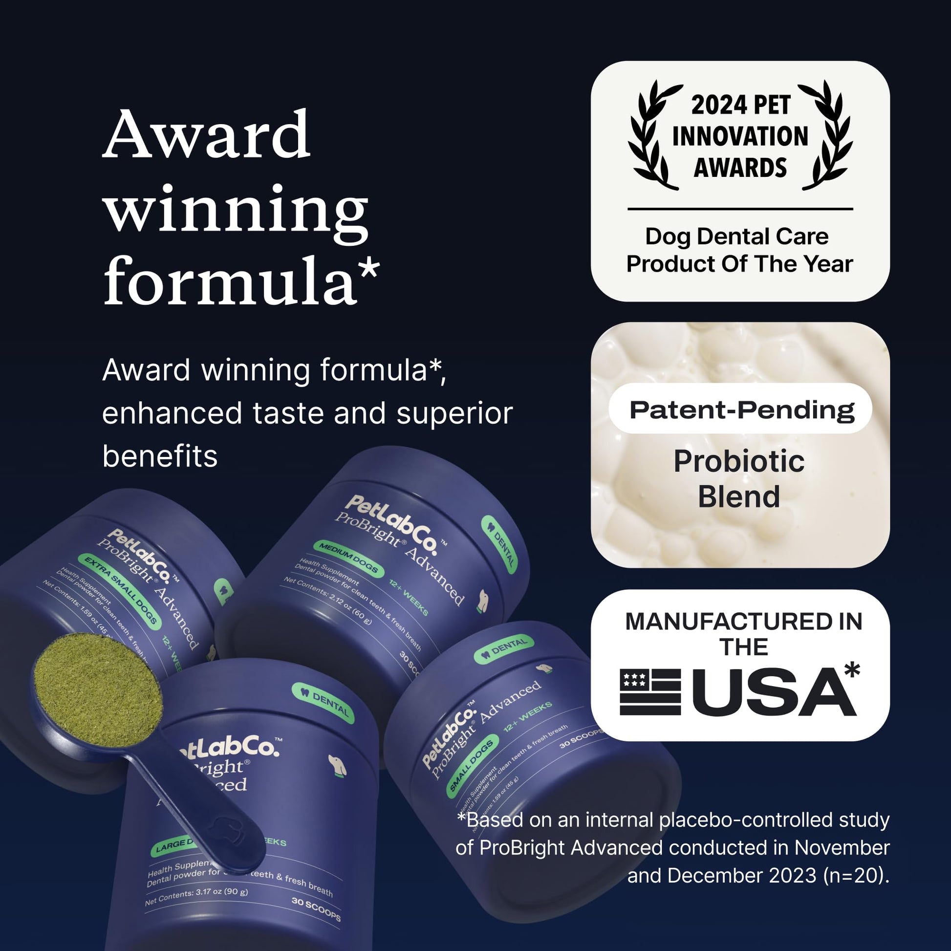 - Award-Winning, Clinically Tested* Formula - ProBright Advanced is the dog dental care product of the year—now with a new flavor, superior ingredients, and a clinically tested formula. In just 28 days, daily use was shown to significantly reduce bad breath–causing compounds. Say goodbye to toothpaste, brushing battles, and dental sticks. Say hello to ProBright—advanced, effortless oral care at its best