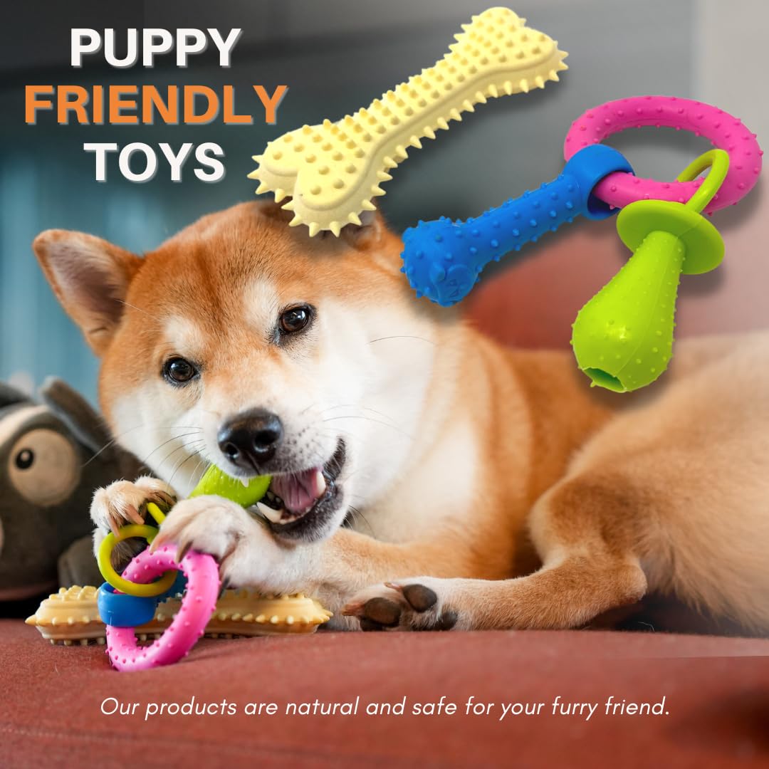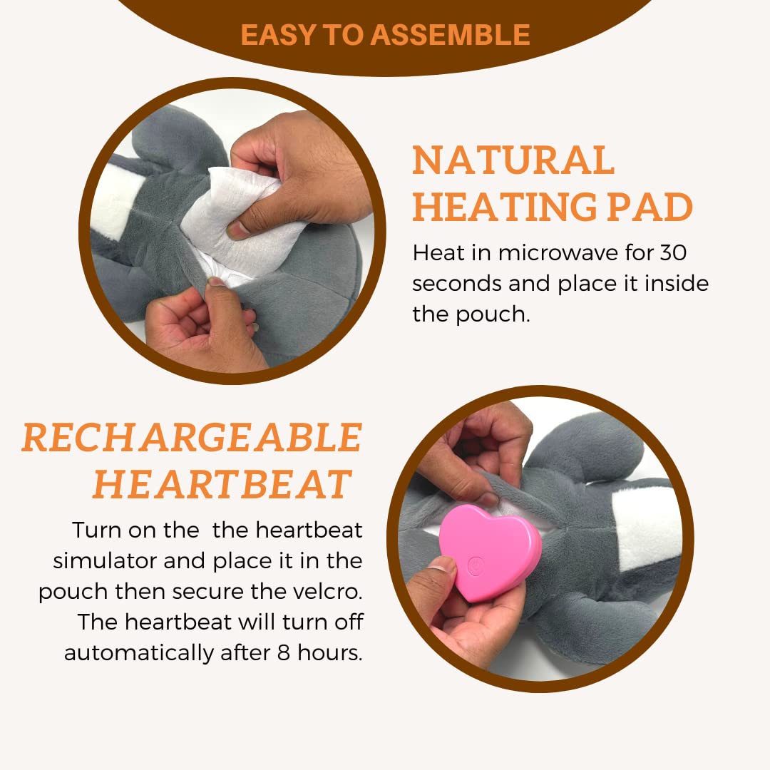 • SCIENCE BEHIND OUR TOY: Our SMART heartbeat puppy module is made to be long lasting. Once you turn on the heartbeat, it will run for 8 hours and TURN OFF AUTOMATICALLY. This puppy sleeping buddy will release warmth and have a real heartbeat simulation which will relieve your pets anxiety and irritation. INCLUDES: 1 chew bone, 1 puppy chew teething pacifier, 1 reusable heating pad, 1 rechargeable heartbeat module, 1 charging cable