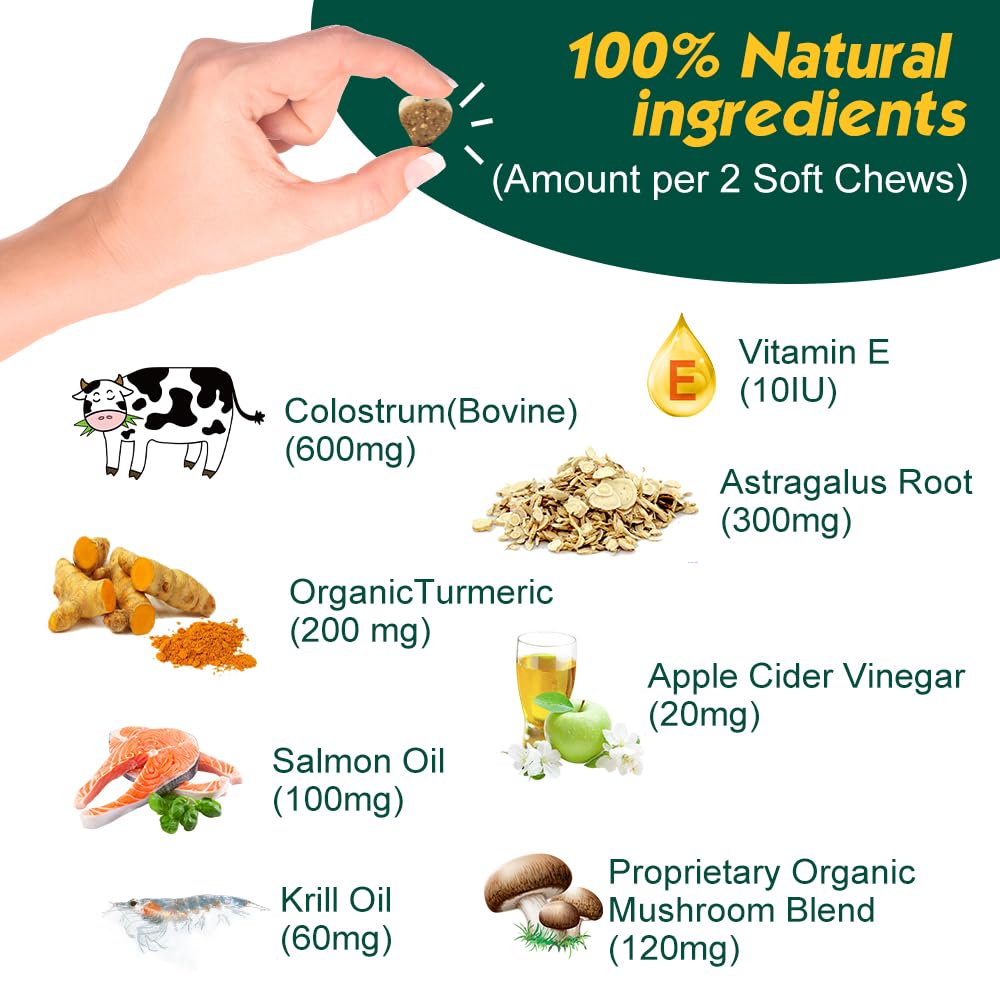 - Strengthen Your Dog’s Immune System Naturally: Enriched with 600mg of Colostrum (Bovine), a natural source of antibodies, these chews help bolster your dog's immune defenses, aiding in faster recovery and overall health maintenance.