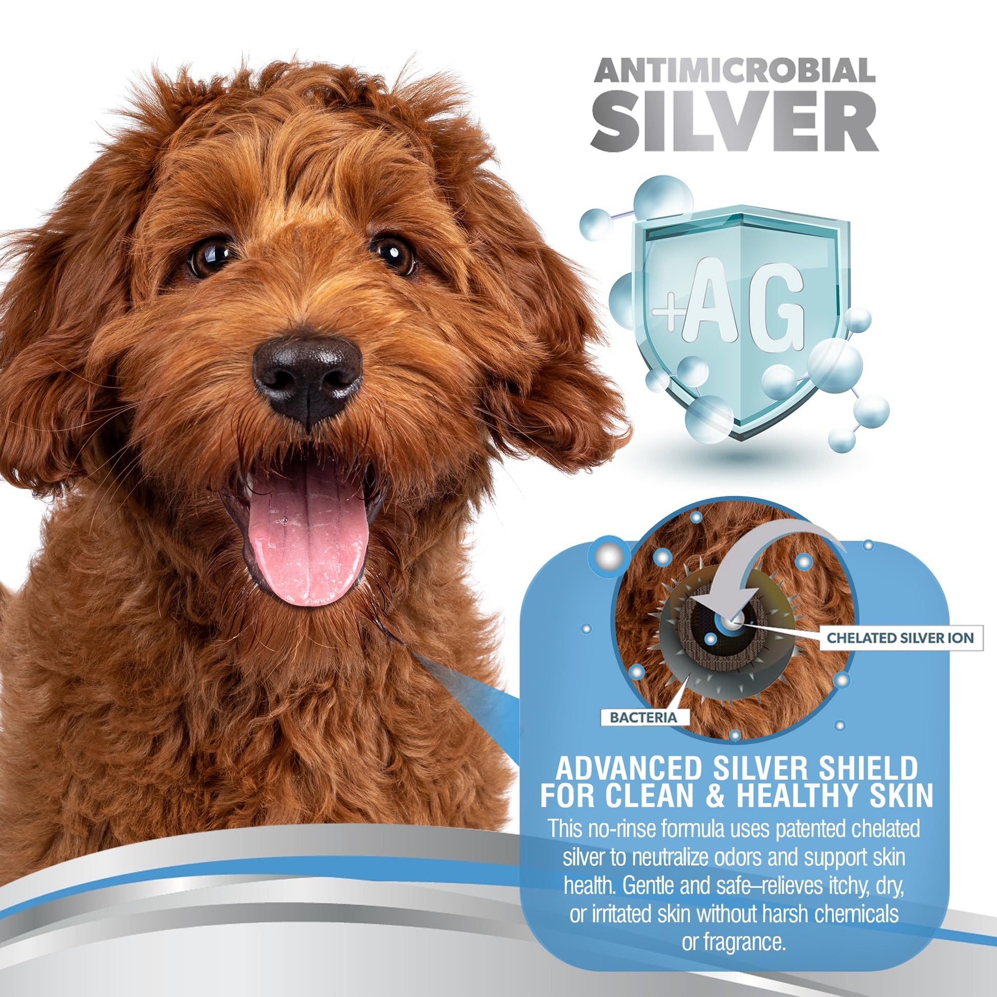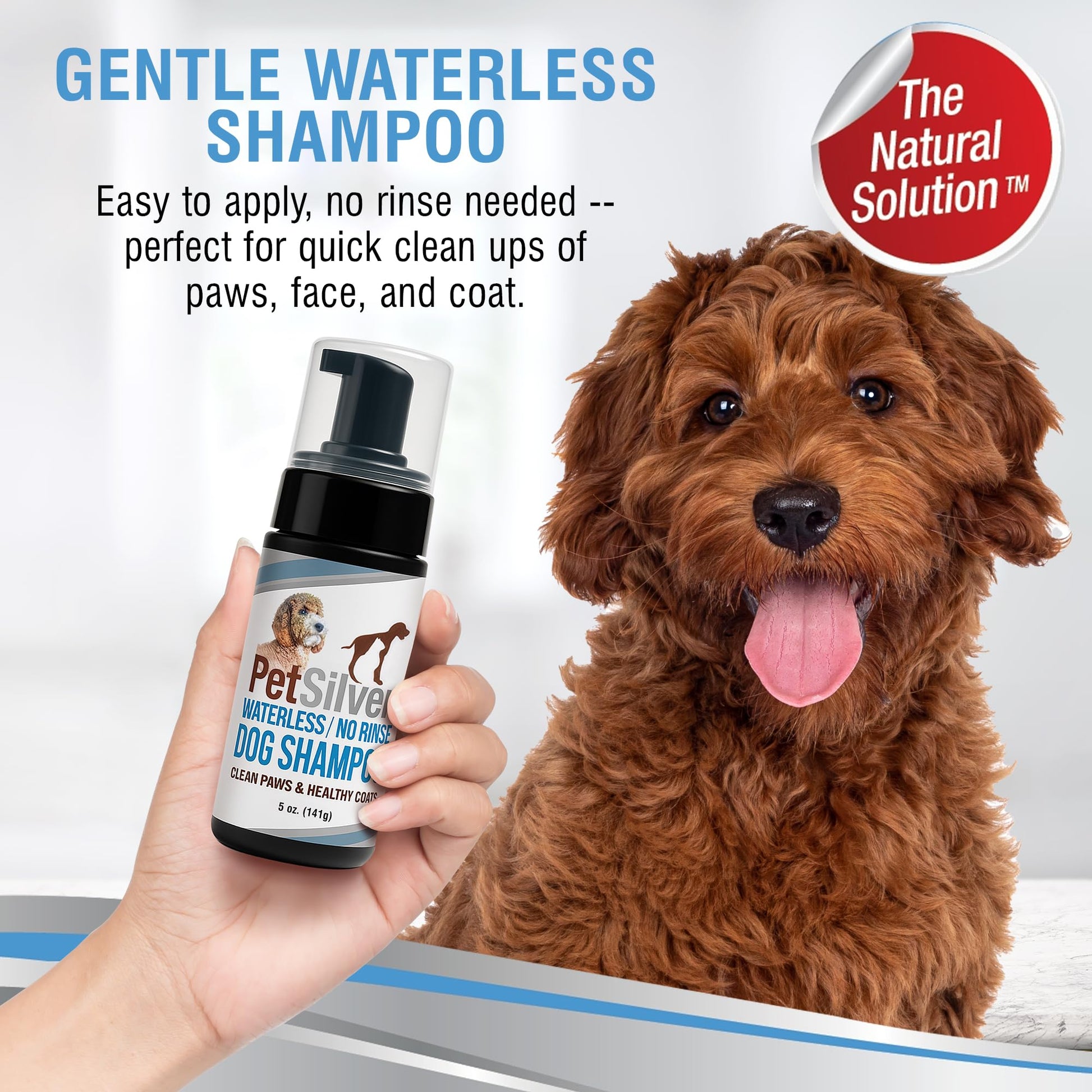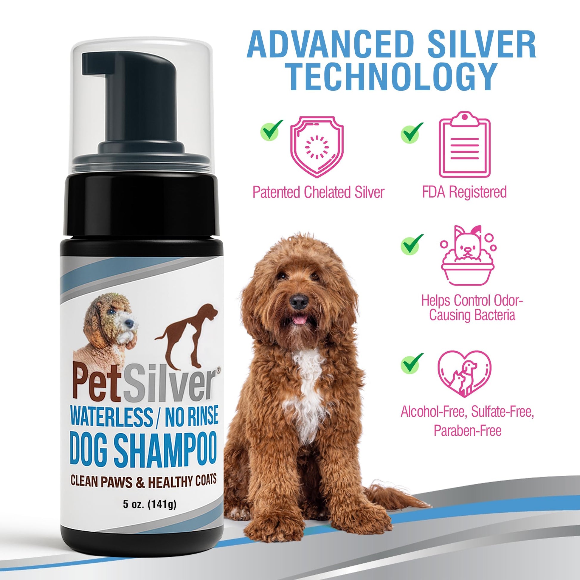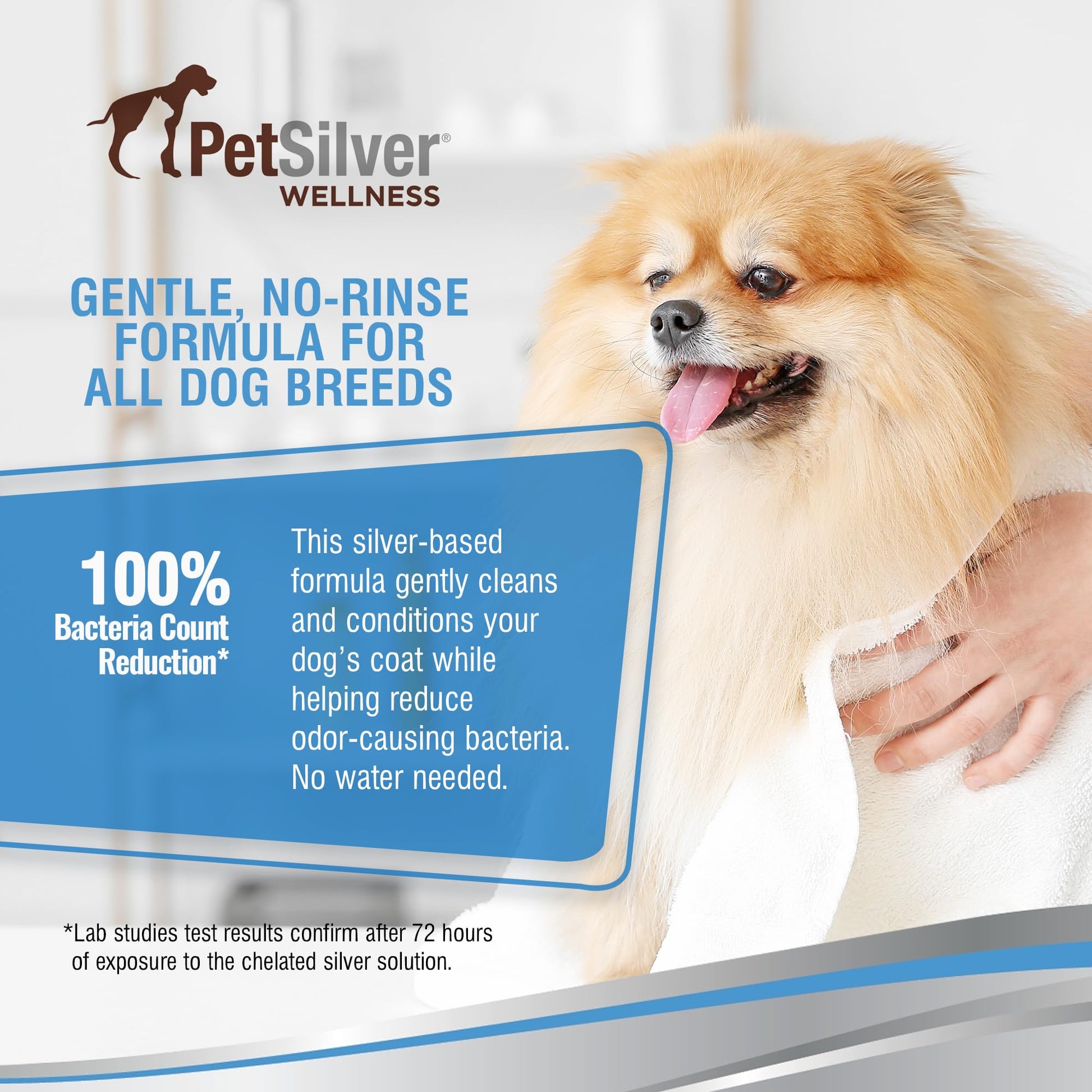 PetSilver Waterless Dog Shampoo - No Rinse Bath & Dry Shampoo for Dogs - Odor Control for Smelly Coats - Cleans, Conditions & Moisturizes - Hypoallergenic & Fragrance-Free - Patented Silver - 5 fl oz
