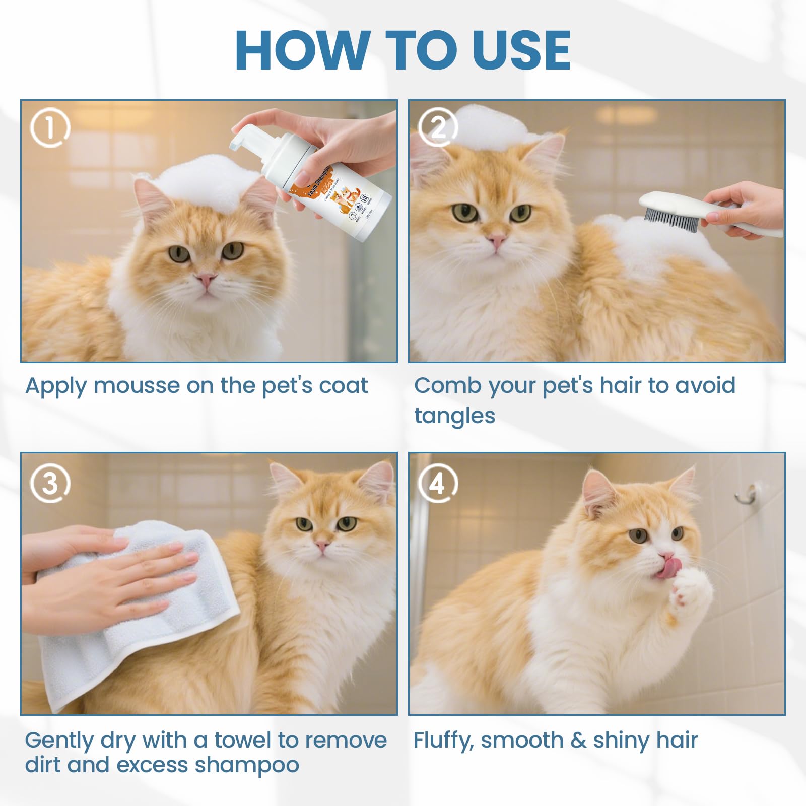 • Easy to Use: Simply spray the waterless cat shampoo onto your pet's fur, then gently brush out any tangles with cat brush. No need to rinse with water. In just a few minutes, your pet will have smooth, tangle-free, soft, and easy-to-manage fur.