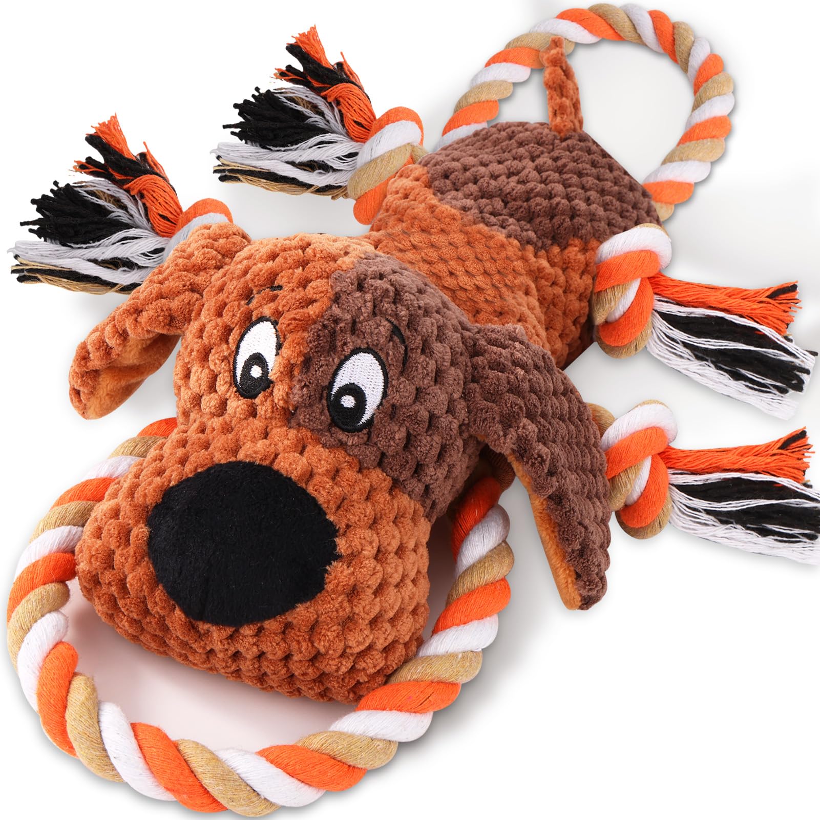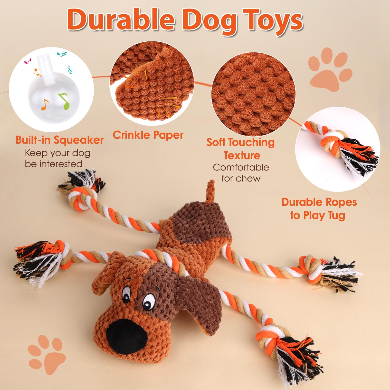 Plush Dog Toys with Rope, Squeaker & Crinkle Paper – Interactive Squeaky Chew Toy for Large Dogs & Puppies – Tough Pet Toy for Tug of War, Fetch & Dental Exercise