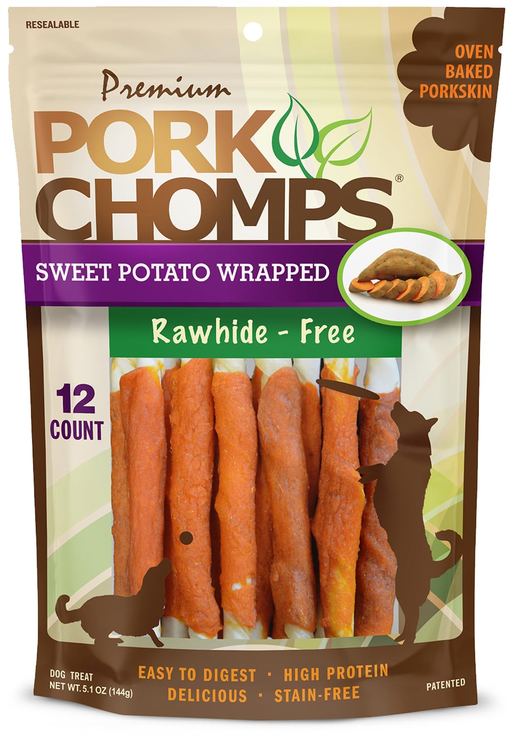 Details: Premium Pork Chomps 5” Pork Skin Mini Twists Wrapped with Real Sweet Potato are fully digestible and the perfect rawhide alternative for your pup!! Pork Chomps are made from baked pork skin creating a healthy, low fat, high protein dog chew. This wholesome chew has no artificial flavors or dyes, and is preferred by dogs everywhere! Premium Pork Chomps are the long lasting rawhide alternative that will keep you pup constructively chewing for hours! In 2012, The University of Illinois College of Veterinary Science conducted a study which proved pork skin to be 99.9% digestible and significantly more digestible than beef rawhide. Offering a variety of sizes, shapes and flavors, Premium Pork Chomps is the chew dogs crave and pet parents can feel good about too! Safe and Healthy Premium Pork Chomps 5” Pork Skin Mini Twists Wrapped with Real Sweet Potato are the right size for Miniature Dogs, Small Dogs and Medium Dogs. 12 Count Resealable Package.