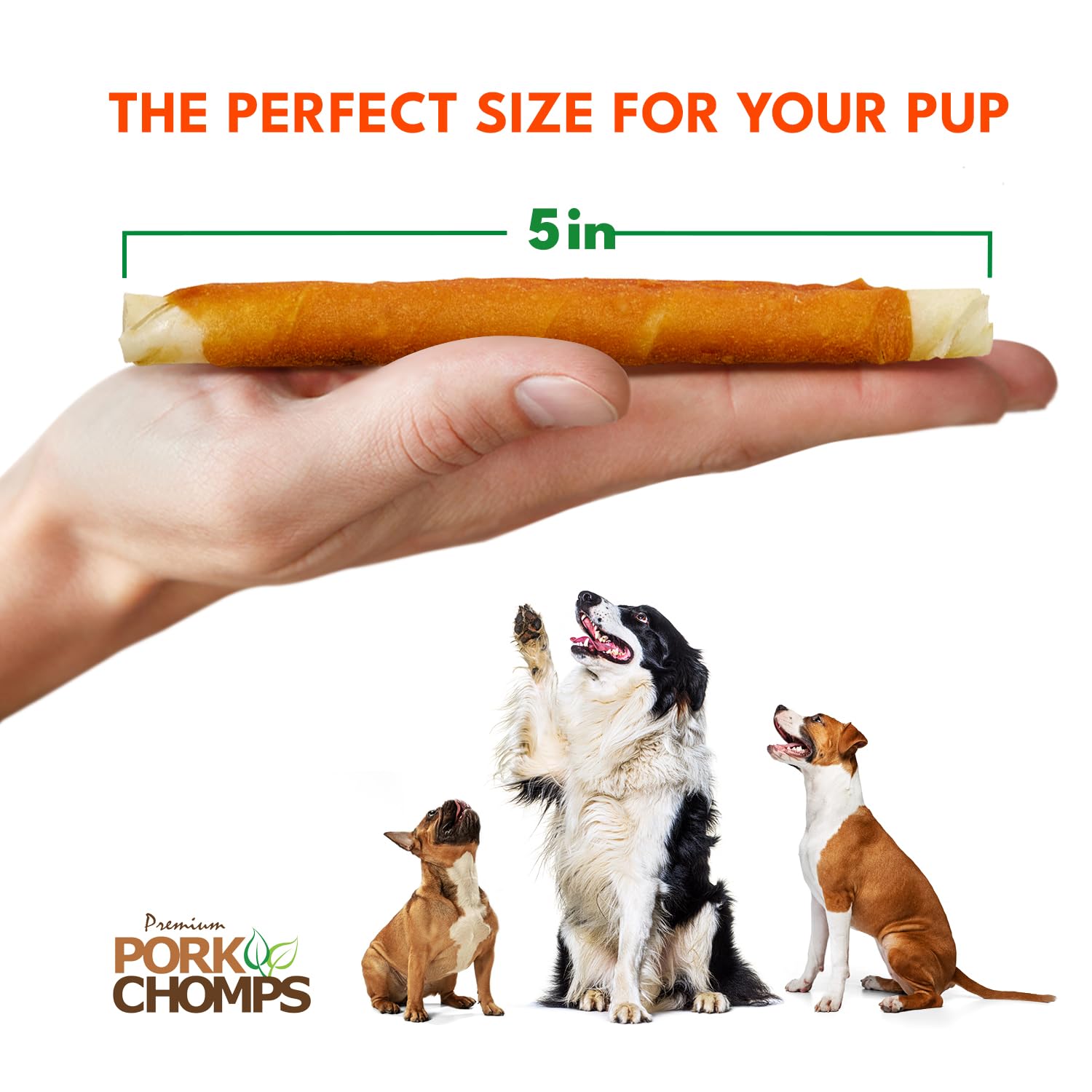 - Perfect for Small, Medium & Big Dogs - Dogs of all sizes love our Pork Chomps. Recommended size is slightly larger than your pet’s mouth.