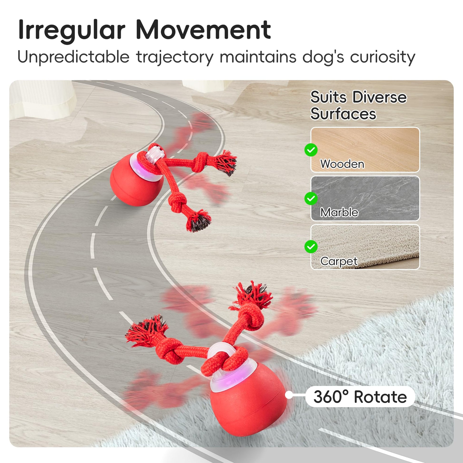 • Interactive Rolling Ball for Active Play – This motorized dog ball toy rolls around with a moving rope attachment, providing an enticing chase that keeps small and medium dogs entertained. Perfect for puppies and chewers, this funny and smart design stimulates their natural hunting instincts, making playtime extra exciting.