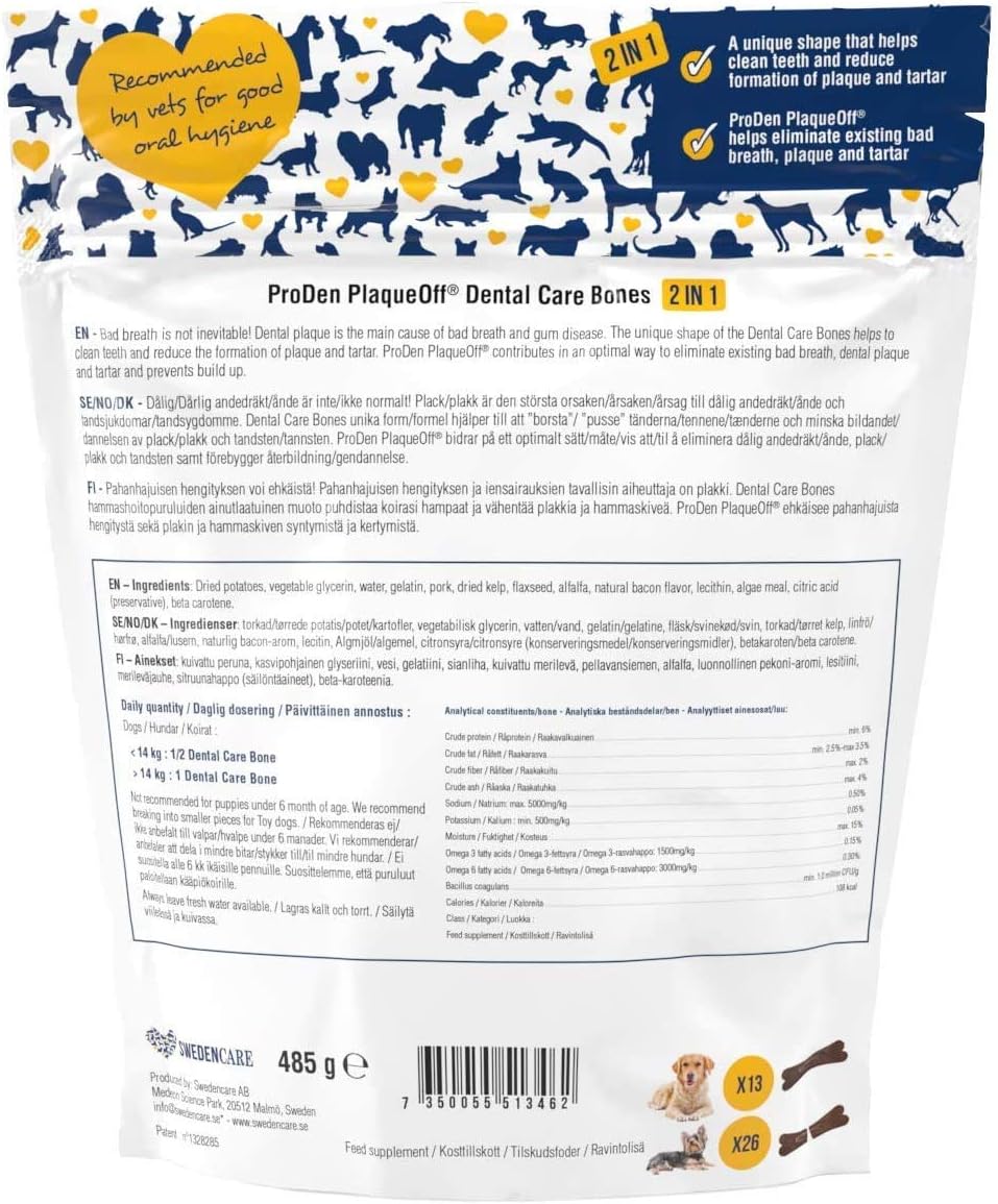 Details: Description Turn treat time into teeth-cleaning time with the ProDen PlaqueOff System Dog Dental Care Bones Natural Bacon Flavor. These gnaw-tastic dental care chews are made with natural sea kelp and algae to help clean teeth, reduce tartar, and freshen breath. It’s the 100% natural complement to your pal’s dental hygiene that he’ll love as an anytime reward, thanks to its delicious natural bacon flavor. They’re also a great source of omega-3 and 6 fatty acids from flaxseeds for overall wellness and healthy inflammation. Made with wholesome ingredients like potatoes, pork, kelp, and alfalfa, you can feel good about giving them to your pup. Plus, they contain no grain, wheat, gluten, soy, corn, artificial flavors, colors, or preservatives. Key Benefits Helps clean teeth, reduce tartar, and freshen breath with natural sea kelp. Made with wholesome ingredients like potatoes, pork, kelp, and alfalfa. Delicious natural bacon flavor that most dogs find irresistible for gnawing. Good source of omega-3 and 6 fatty acids from flaxseeds to support overall wellness. Perfectly-portioned for medium size dogs, and can easily break in half for smaller pups. Precautions Not recommended for puppies under 6 months or dogs weighing less than 5 lbs. Not recommended for dogs with hyperthyroidism.